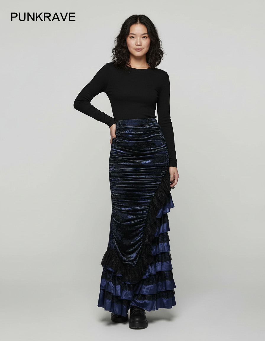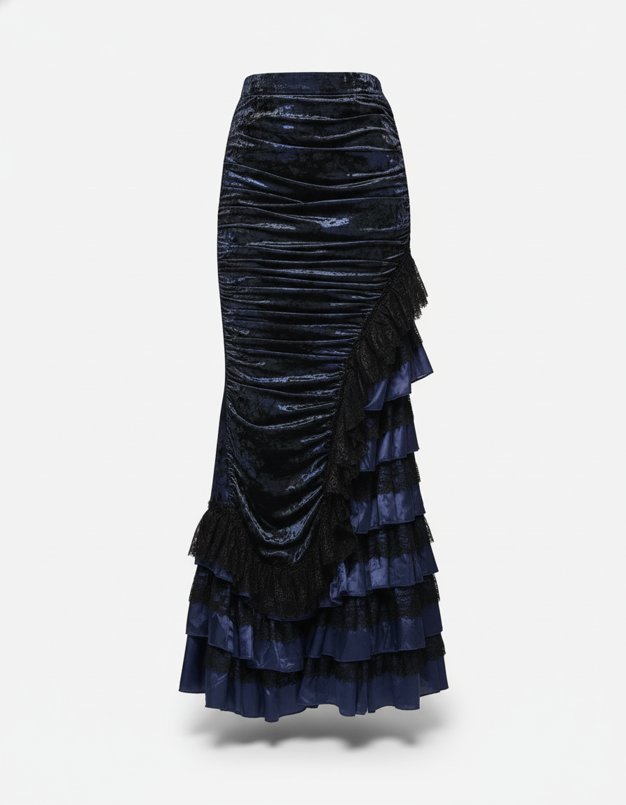Découvrez la Jupe Longue Velours Asymétrique Élégante, une pièce maîtresse conçue pour la femme moderne qui ne craint pas d'affirmer son style. Confectionnée dans un somptueux velours bleu marine, cette jupe enveloppe la silhouette avec une grâce inégalée, offrant une texture riche et un éclat discret qui capte la lumière à chaque mouvement. Son design asymétrique audacieux, rehaussé de volants délicats et de dentelle subtile, crée un jeu de volumes captivant et une silhouette dynamique, loin des conventions.