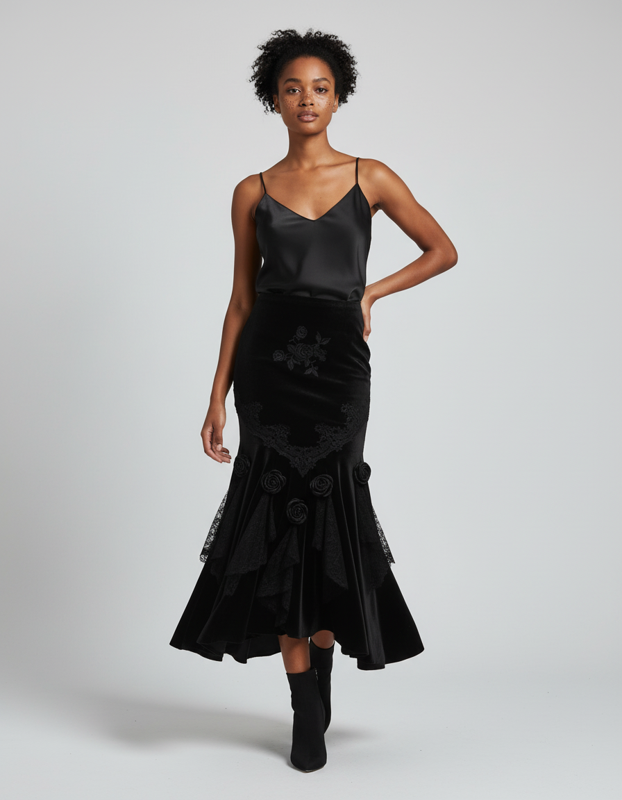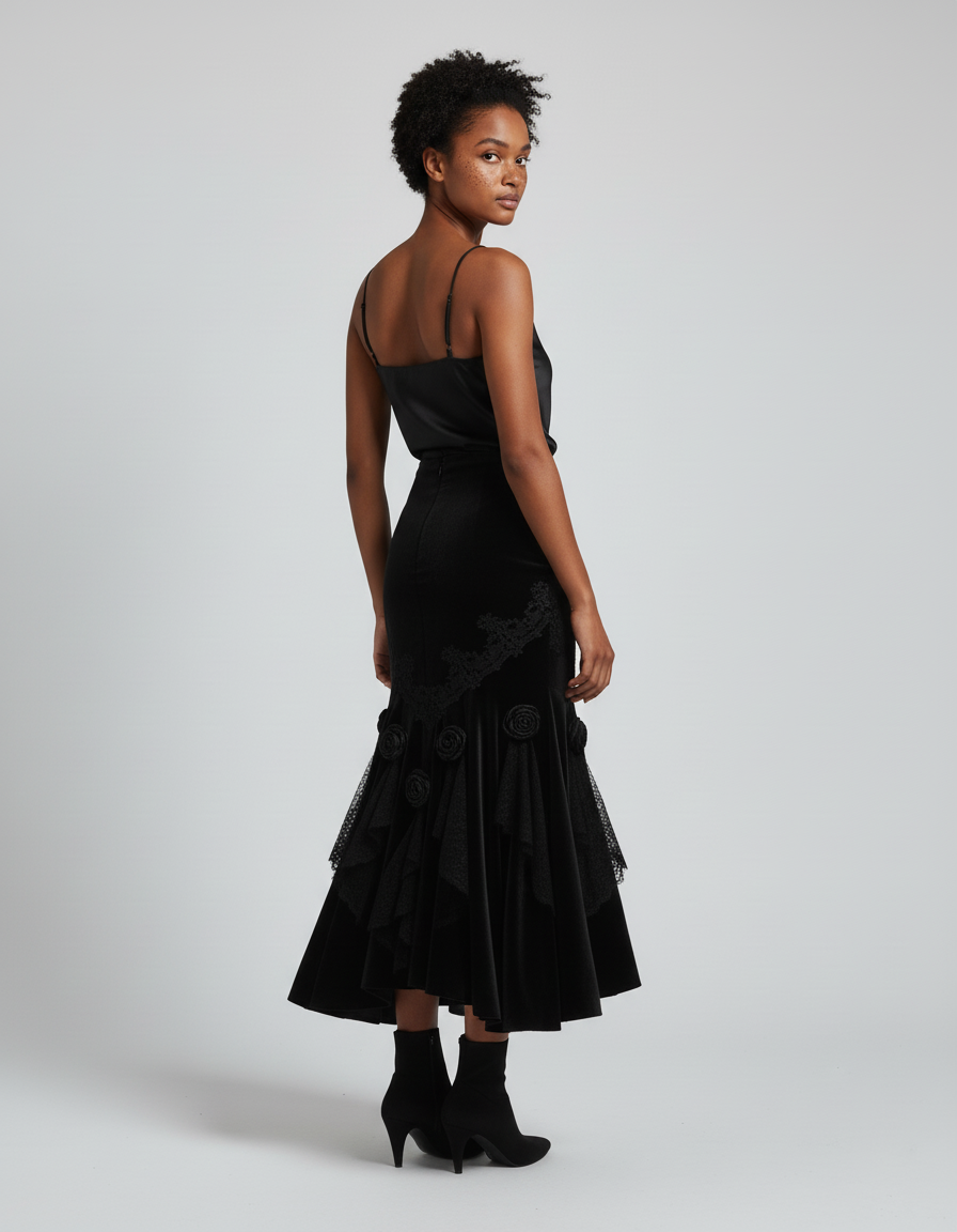 Nous savons que l'élégance ne doit jamais sacrifier le confort. C'est pourquoi cette jupe ample a été méticuleusement coupée pour offrir une liberté de mouvement absolue. Son velours somptueux, d'une douceur incomparable, épouse et sublime votre silhouette sans jamais la contraindre. Le tombé fluide et gracieux, accentué par les volants délicats et les applications en dentelle, crée une silhouette dynamique et aérienne à chaque pas. Vous vous sentirez non seulement sublimée, mais aussi parfaitement à l'aise, prête à conquérir la soirée ou la journée avec une assurance naturelle et une sophistication sans effort.