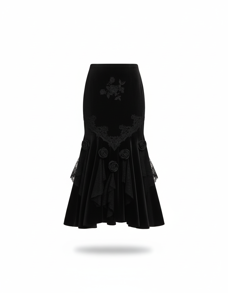 Cette jupe longue est confectionnée en velours noir. Elle présente des motifs brodés sur la partie supérieure et un ourlet évasé avec des superpositions de tissu et des ornements.