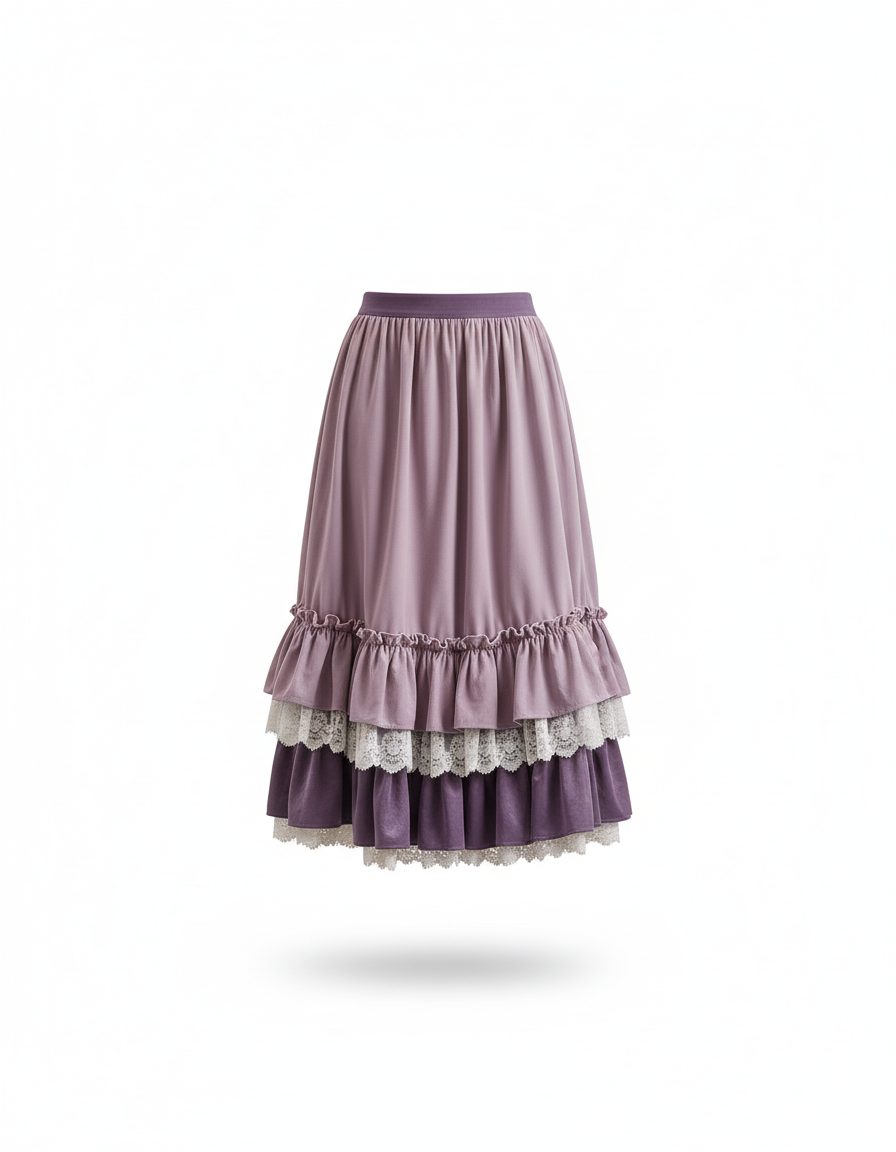 Jupe Longue Velours Dentelle à Volants et Patchwork