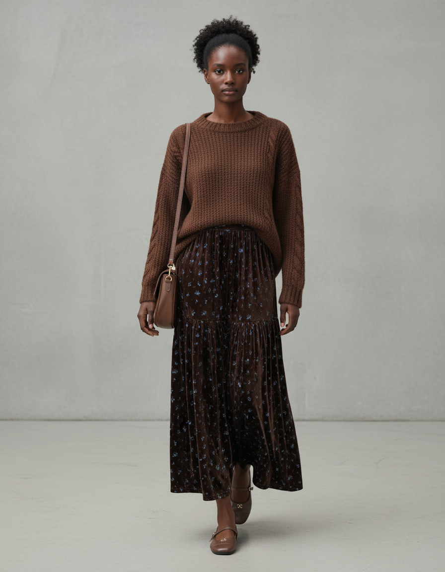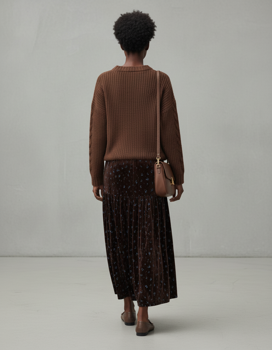 La Jupe Longue Velours Floral Élégante est conçue pour transcender les occasions avec une facilité déconcertante. Pour une journée décontractée mais raffinée, associez-la à un pull en maille épaisse et des bottines pour un look hivernal sans effort, comme en témoigne son allure naturelle. Transformez-la pour le soir en optant pour un chemisier en soie et des escarpins, sublimant son velours riche et son motif floral délicat. Sa teinte profonde et ses subtils motifs bleus s'harmonisent avec une palette variée, vous permettant de créer des tenues uniques, du bureau aux dîners élégants, toujours avec une touche distinctive et haut de gamme.