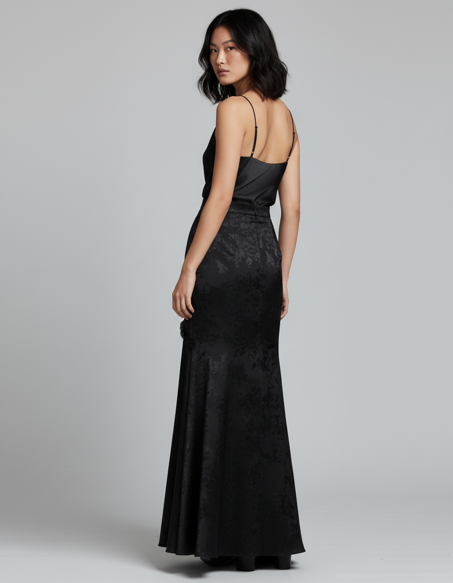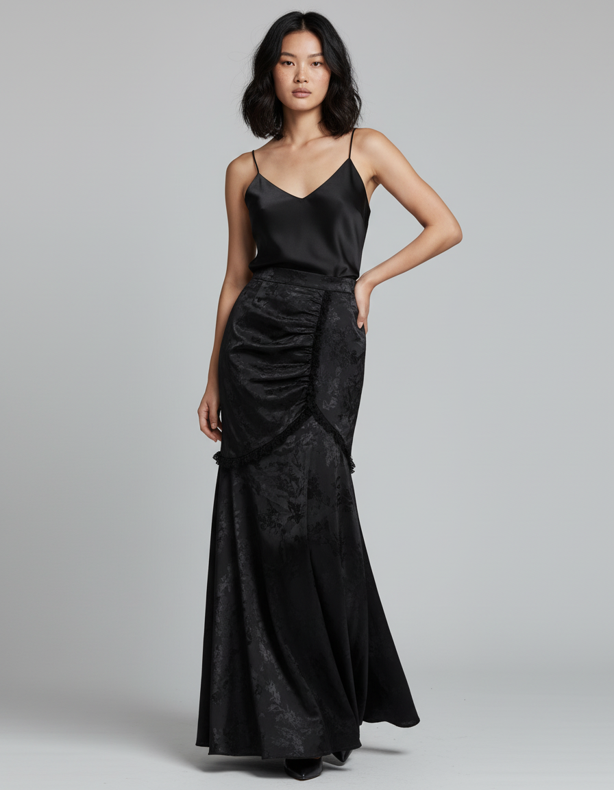 Pièce maîtresse de votre garde-robe de soirée, cette jupe se prête à des associations infinies. Pour une élégance intemporelle, mariez-la à un caraco en soie fluide, comme le veut la tendance. Osez la mixer avec un blazer ajusté pour un look plus contemporain, ou un chemisier délicat en dentelle pour une touche romantique. Complétez votre tenue avec des talons fins et des accessoires raffinés pour parfaire une silhouette inoubliable, parfaite pour les galas, cocktails ou dîners d'exception.