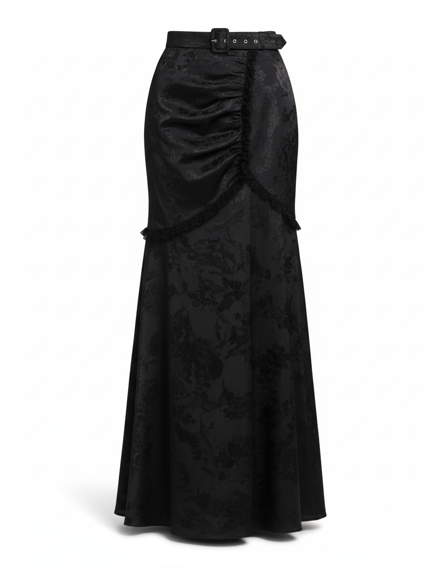 Cette jupe est un vêtement long de couleur noire. Elle présente un motif jacquard sur un tissu d'apparence velours.