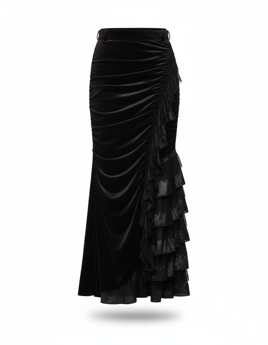 Jupe Longue Velours Noir Volants Dentelle Gothic : Design Asymétrique et Plissé