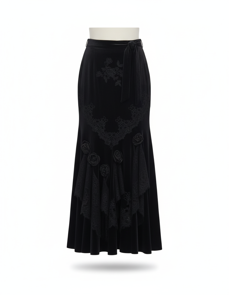 Cette jupe longue est de couleur noire et confectionnée en velours. Elle présente des motifs brodés ou appliqués sur le devant, ainsi que des superpositions de tissu vers le bas.