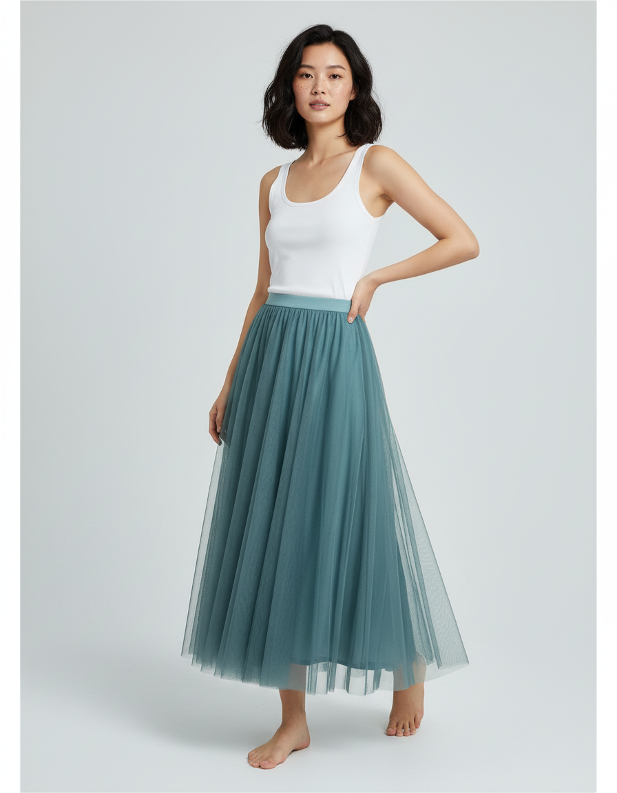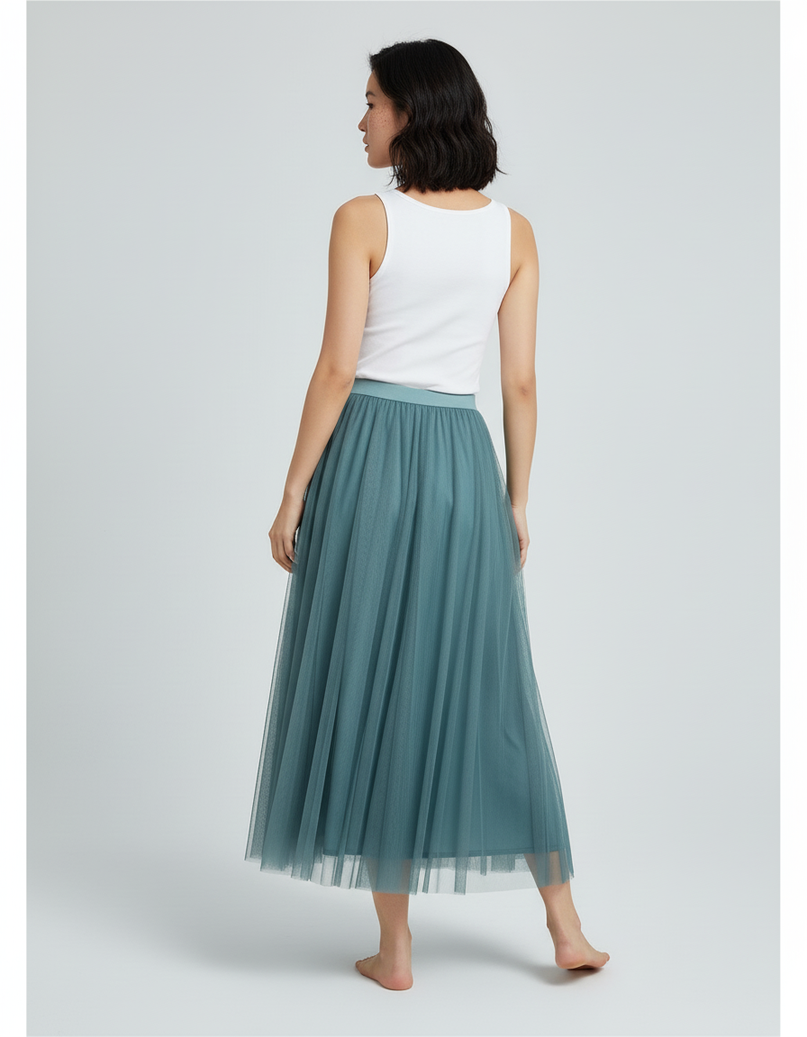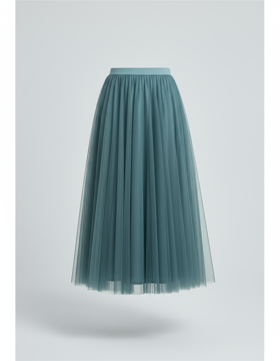 La Jupe Longue Vert-Bleu Plissée Fluide est une ode à la légèreté et à l'élégance intemporelle. Confectionnée dans un tulle aérien de première qualité, sa teinte vert-bleu, à la fois douce et affirmée, capte la lumière avec subtilité. Le plissé délicat confère à cette pièce une structure et un volume parfaits, assurant un tombé fluide et gracieux qui épouse la silhouette sans jamais l'entraver. Chaque mouvement est une danse, chaque pas une affirmation de votre style raffiné.