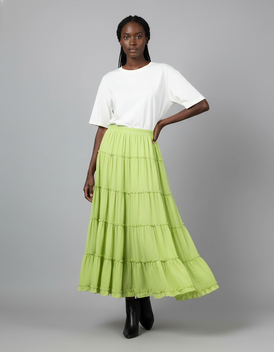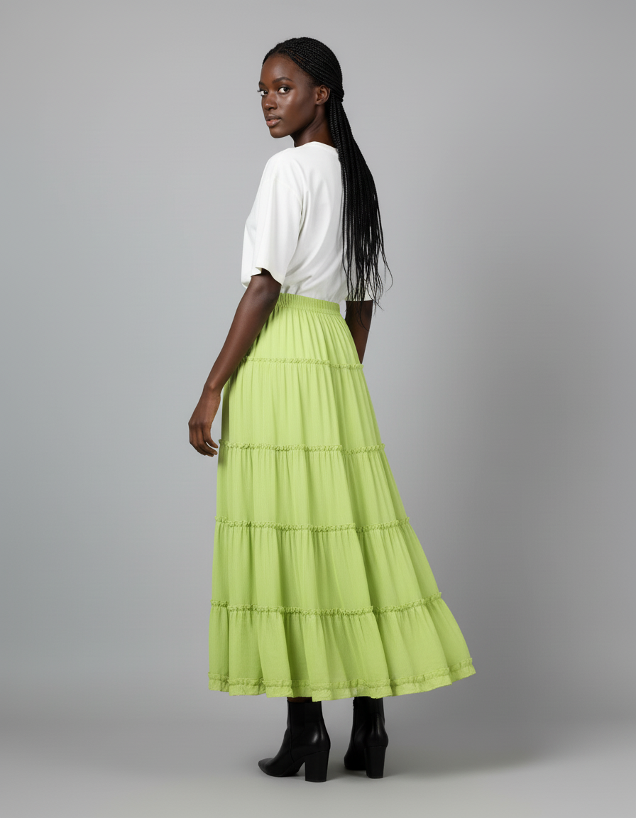 Adoptez un look frais et tendance avec notre jupe longue vert citron à volants fluide, parfaite pour toutes les occasions.