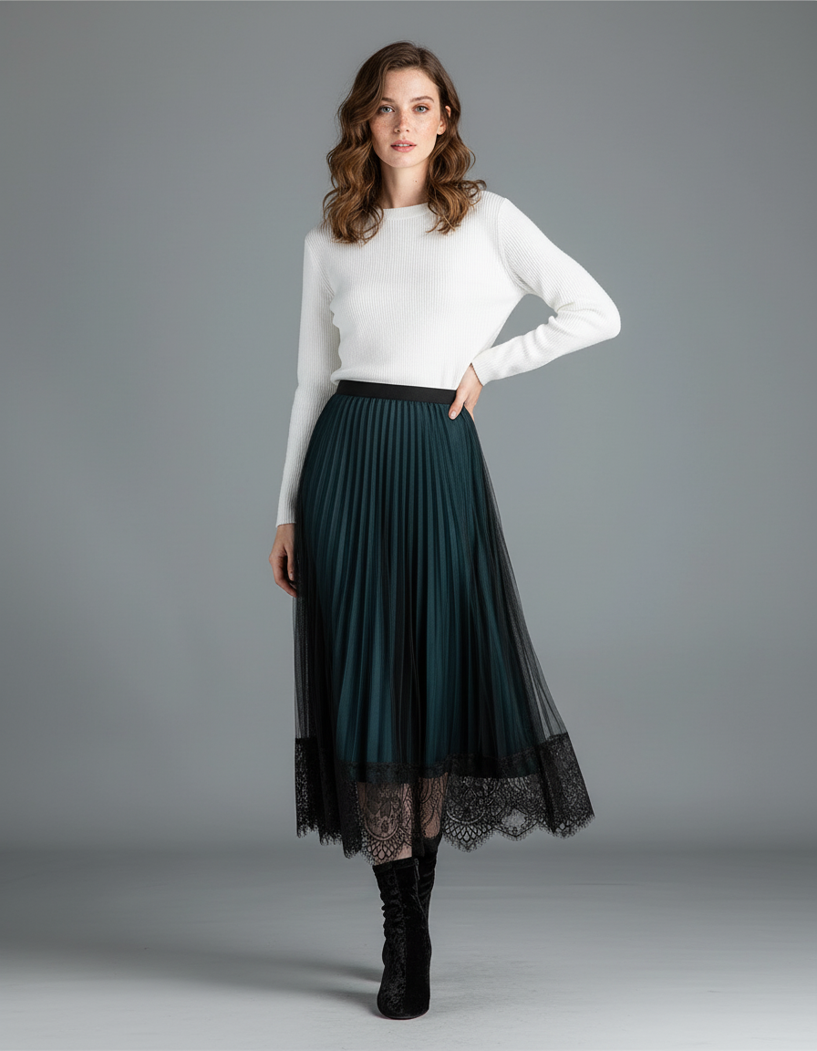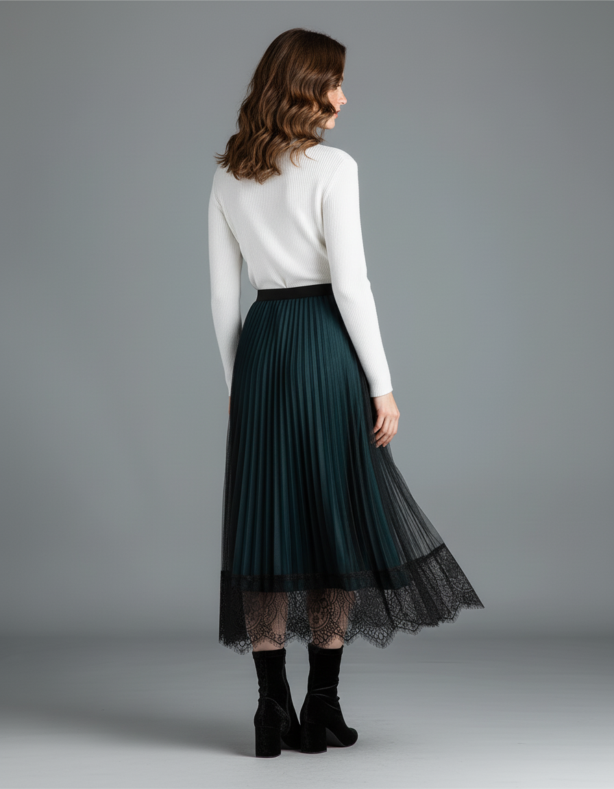 Jupe Longue Vert Émeraude Plissée & Dentelle : L'Éclat d'une Élégance Moderne