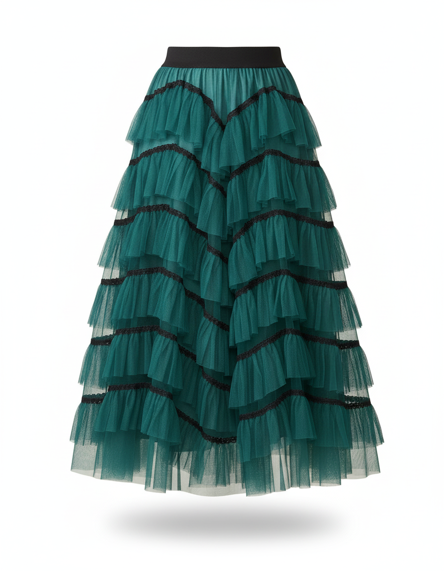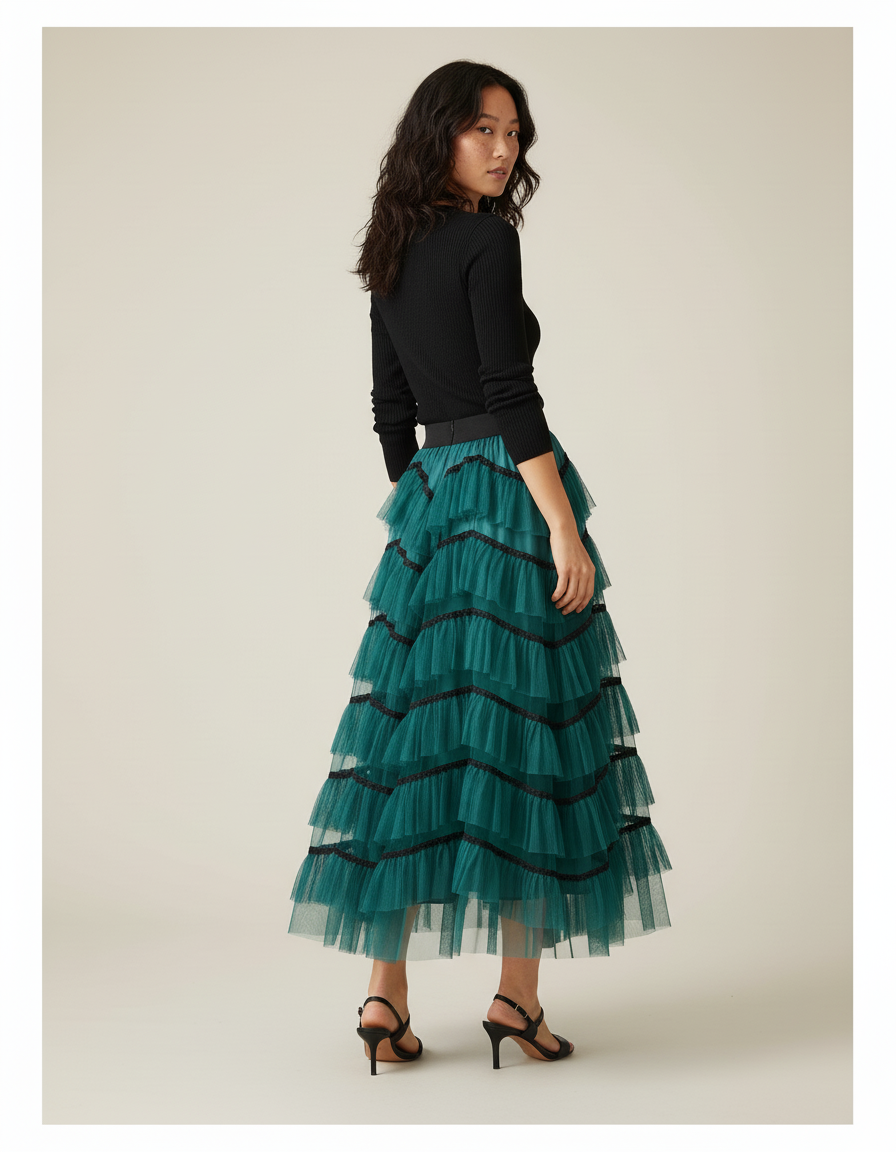 Imaginez une pièce qui danse avec vous. Notre Jupe Longue Vert Émeraude Volants Chic est conçue en tulle aérien, offrant une légèreté incomparable et une liberté de mouvement absolue. Chaque volant, délicatement superposé, crée un mouvement fluide et gracieux à chaque pas. Son tombé impeccable épouse subtilement la silhouette sans jamais entraver, promettant un confort premium du crépuscule à l'aube. Vous vous sentirez à l'aise, élégante et prête à conquérir la soirée.