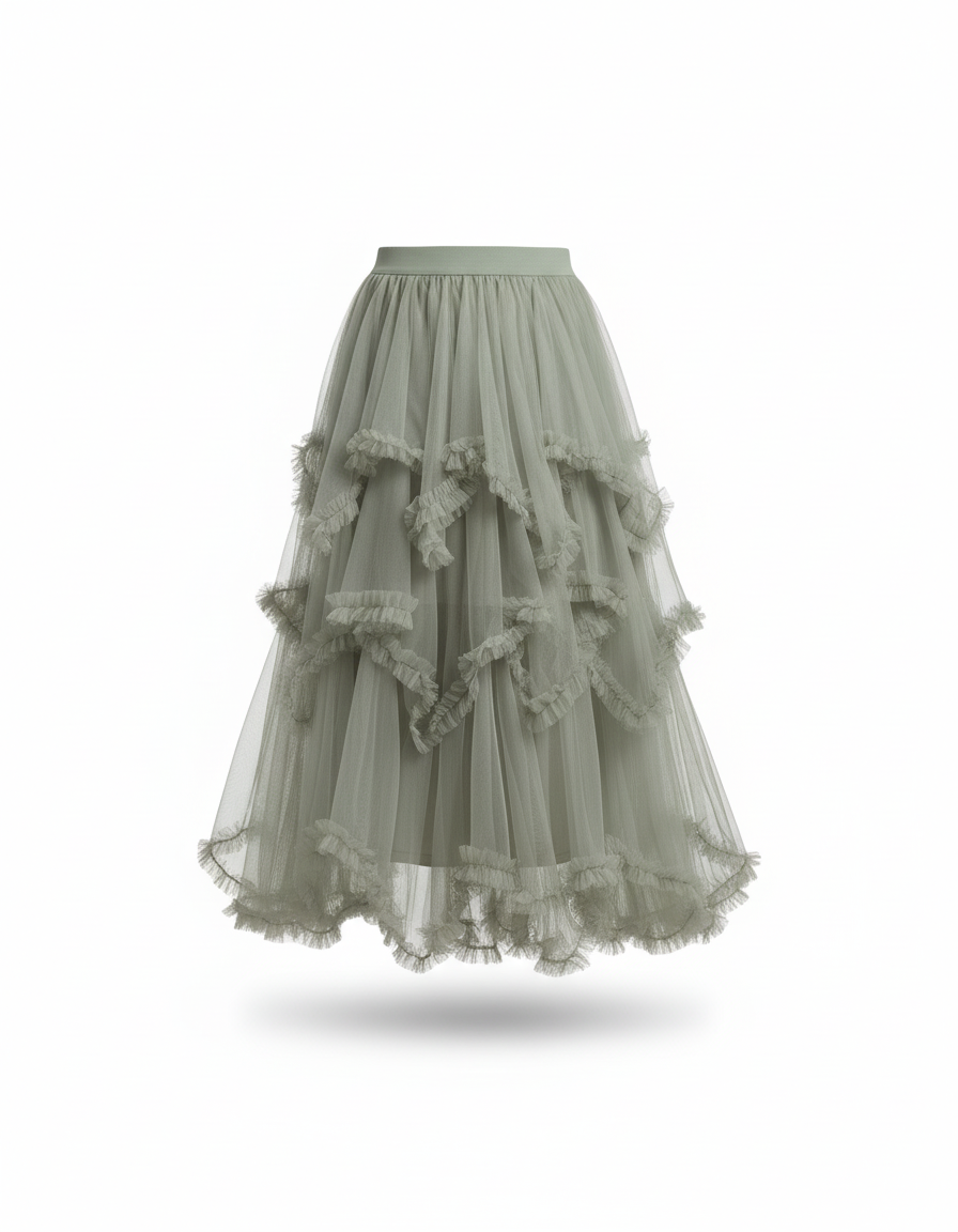 Cette jupe longue présente un tissu en tulle vert sauge avec des volants superposés. Elle dispose d'une taille élastique et mesure 84 cm de longueur.