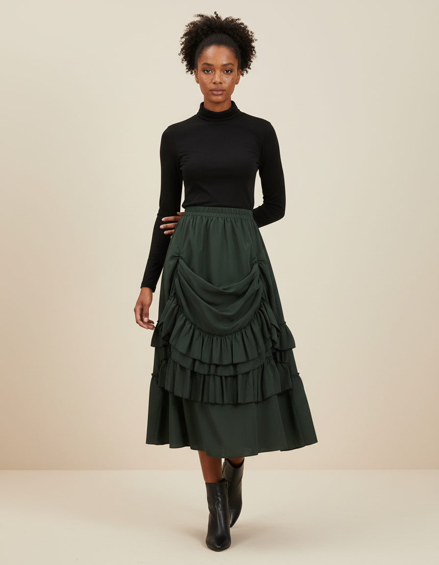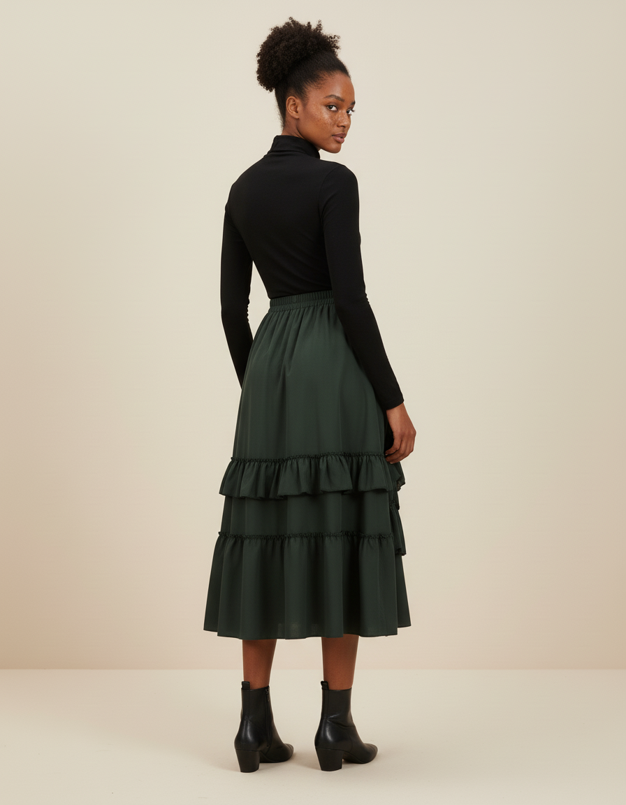 L'Élégance Fluide Redéfinie : La Jupe Longue Verte Chic À Volants