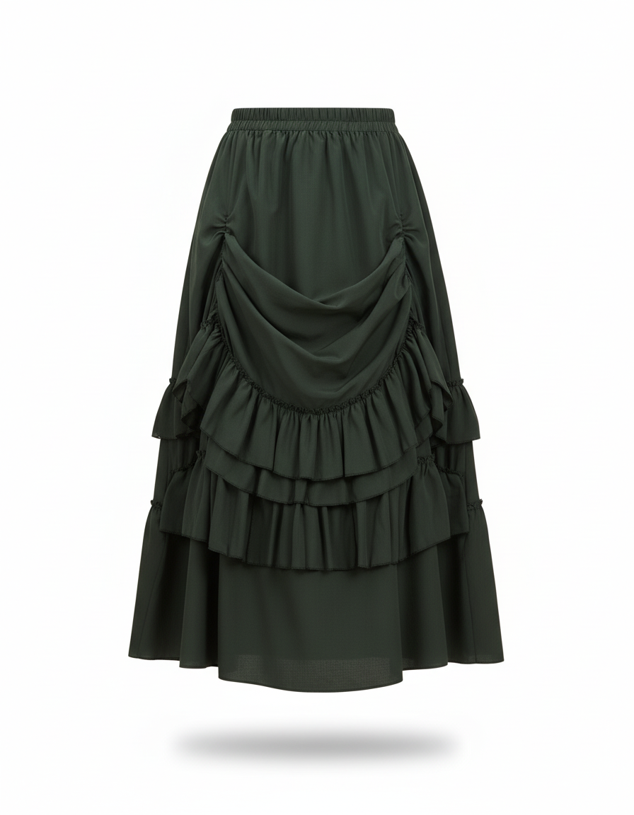Une jupe longue de couleur verte, présentant des détails de volants et des drapés. Ce vêtement est destiné aux femmes.