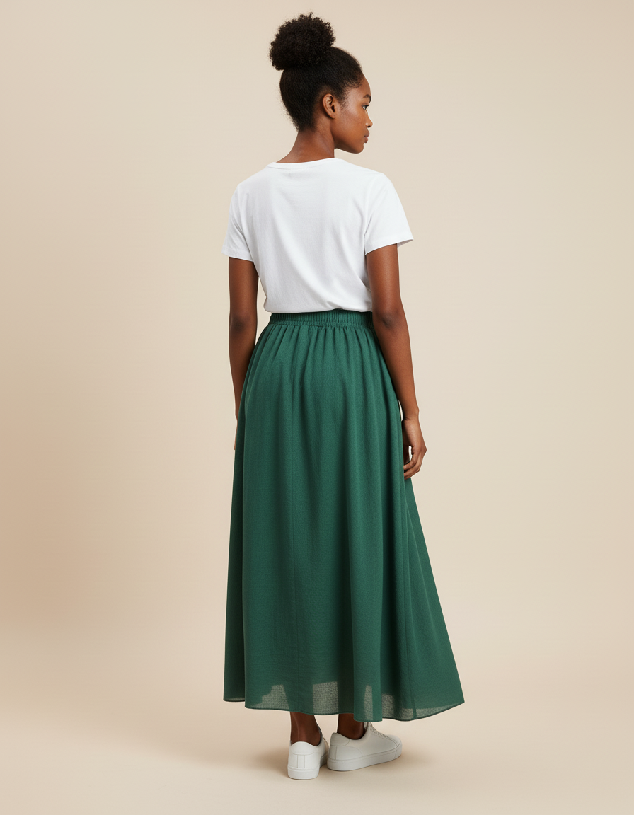 Découvrez notre Jupe Longue Verte Fluide Bohème Style, l'alliance parfaite entre confort et élégance décontractée.