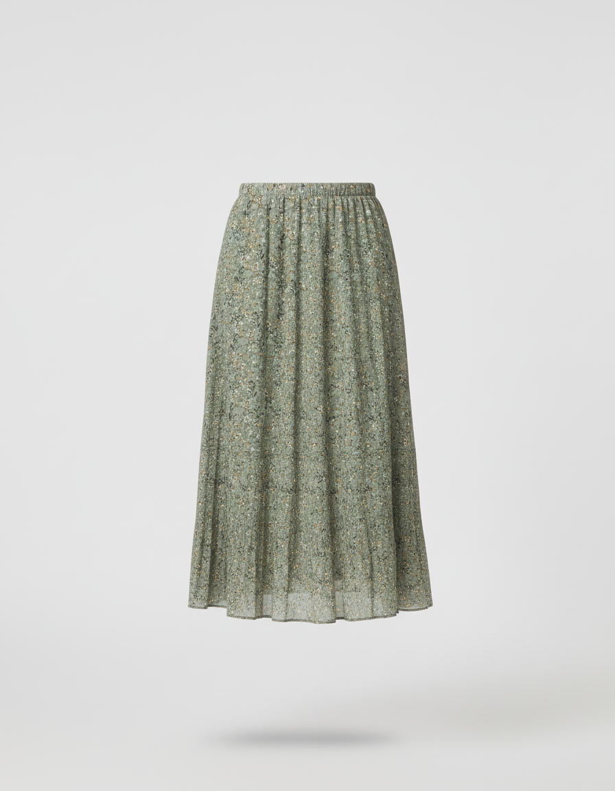 Cette jupe longue est confectionnée en 100% mousseline de soie, avec une taille haute élastique et un design plissé. Elle est dotée d'une doublure et présente un motif floral dans des tons verts.