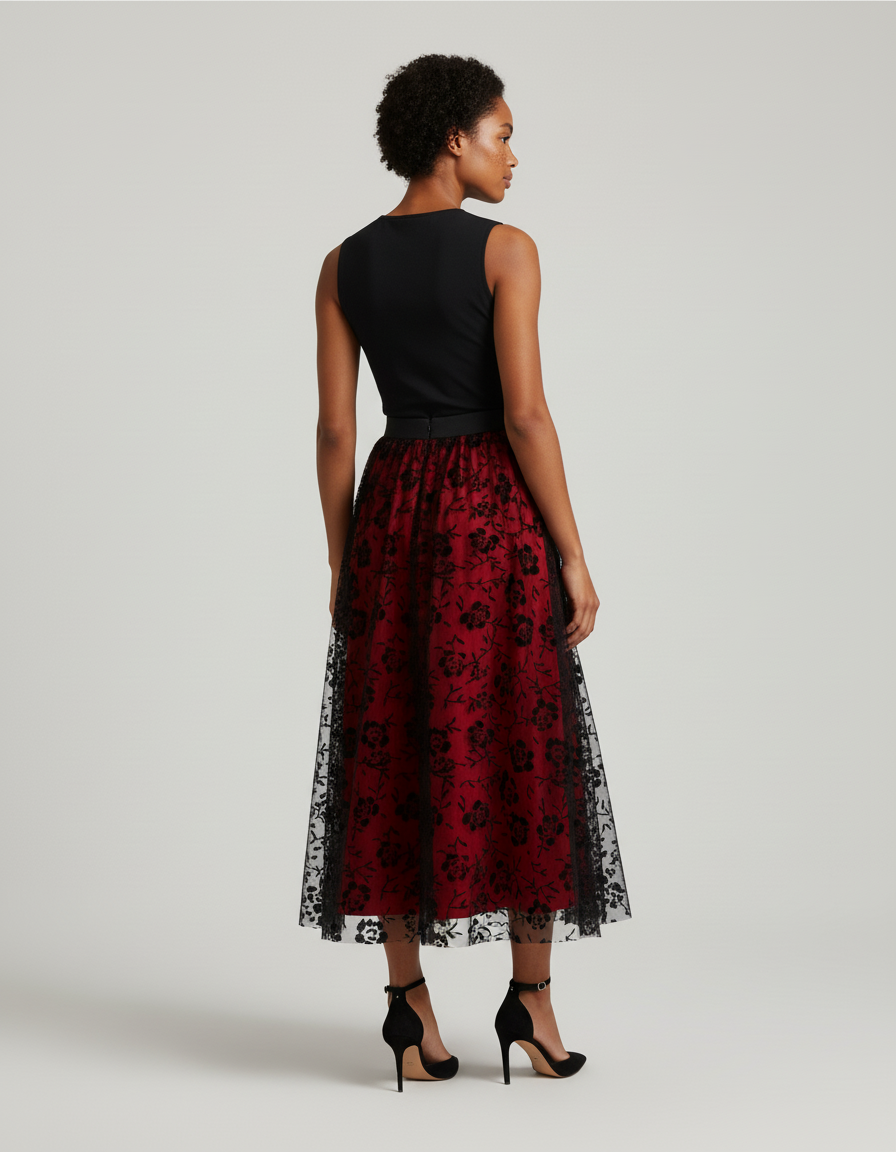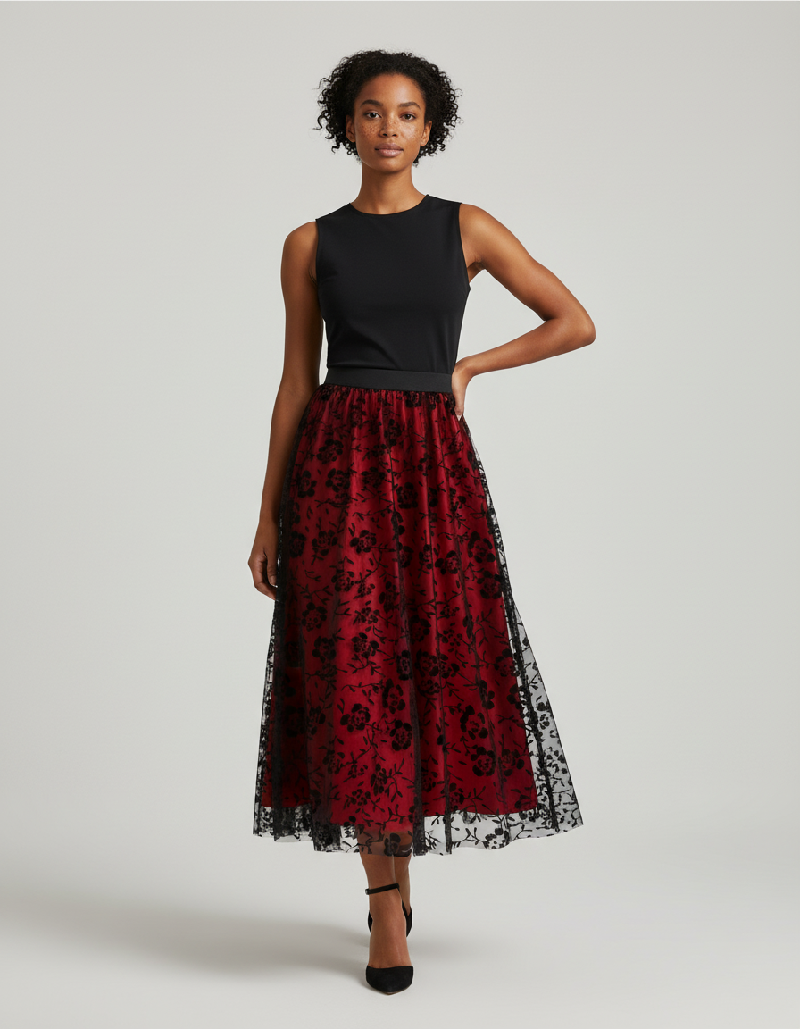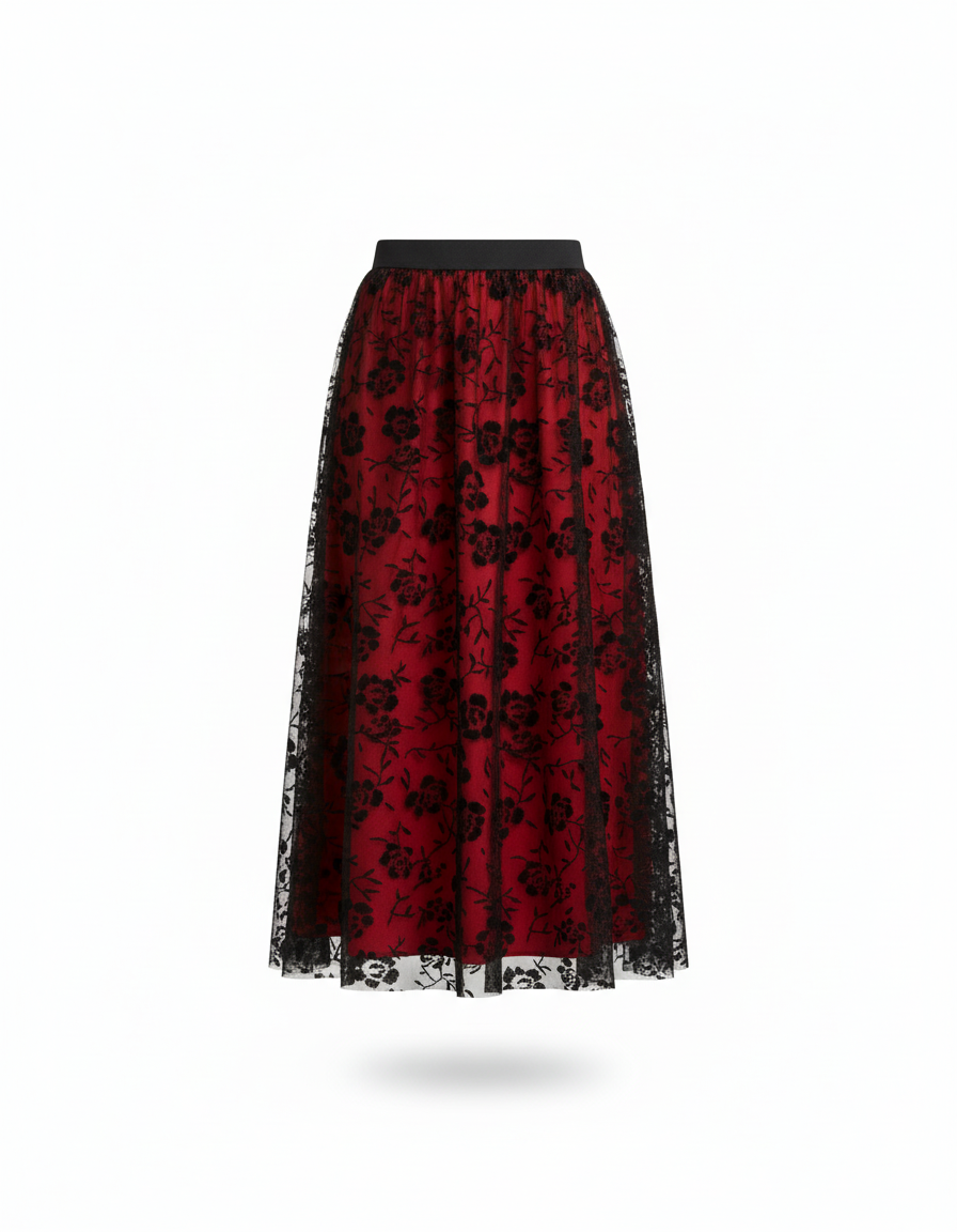 Cette jupe longue est composée d'une doublure rouge recouverte d'un tissu transparent noir à motifs floraux. Sa coupe est évasée, partant d'une taille marquée.