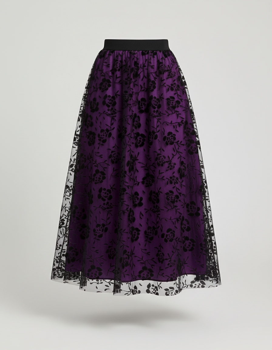 Ce qui la distingue ? Un tulle aérien d'un violet profond, sublimé par un motif floral noir délicatement floqué, qui crée un contraste visuel captivant et une texture riche au toucher. La coupe patineuse taille haute flatte toutes les morphologies, allongeant la silhouette et marquant élégamment la taille. Facile à associer avec un pull fin pour un look chic décontracté ou un chemisier de soie pour une occasion formelle, cette pièce unique est la promesse d'une élégance intemporelle et d'un style qui vous est propre.