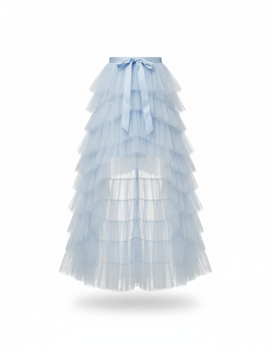 Jupe Longue Voile Bleu en Tulle à Nœud et Ourlet Irrégulier