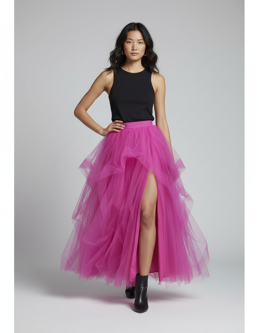 Révélez votre essence avec la Jupe Longue Voile Fendue, une pièce maîtresse conçue pour celles qui osent. Son tulle rose fuchsia, aérien et magnifiquement bouffant, crée un volume spectaculaire qui capte la lumière et les regards. Chaque mouvement devient une danse, chaque pas une affirmation de style. La fente audacieuse, subtilement intégrée, offre une touche de modernité et de sensualité, permettant une liberté de mouvement inattendue et dévoilant juste ce qu'il faut pour intriguer. C'est l'équilibre parfait entre le rêve et la réalité, le glamour et l'audace contemporaine.