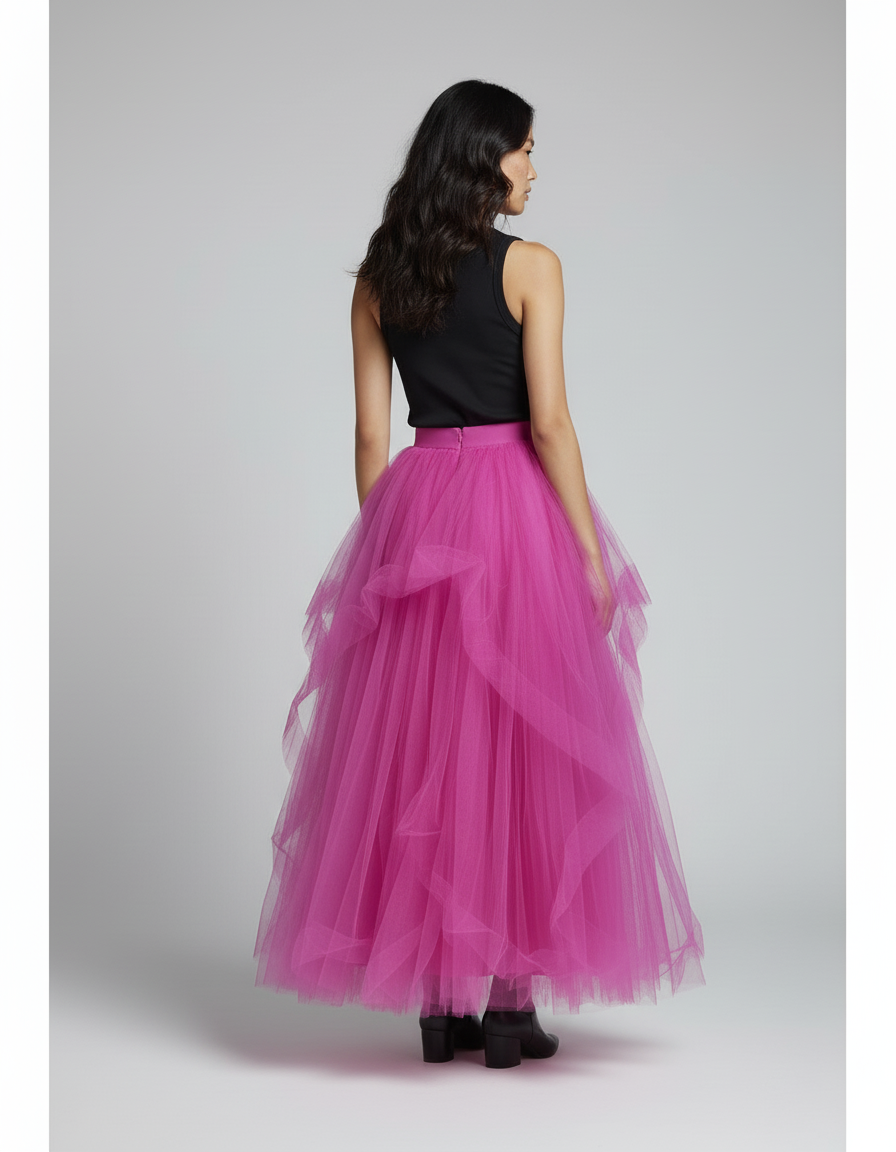 Idéale pour les soirées les plus prestigieuses, cette jupe se marie parfaitement avec un body en soie noire et des talons aiguilles pour un look ultra-glamour. Pour une touche d'originalité et de modernité, comme le suggère notre stylisme, associez-la à un débardeur ajusté et des bottines en cuir : un contraste saisissant qui affirme votre style. Le tulle de qualité supérieure assure un maintien impeccable et une tenue irréprochable, vous permettant de briller avec confiance. Faites de cette jupe la pièce maîtresse de vos moments inoubliables.