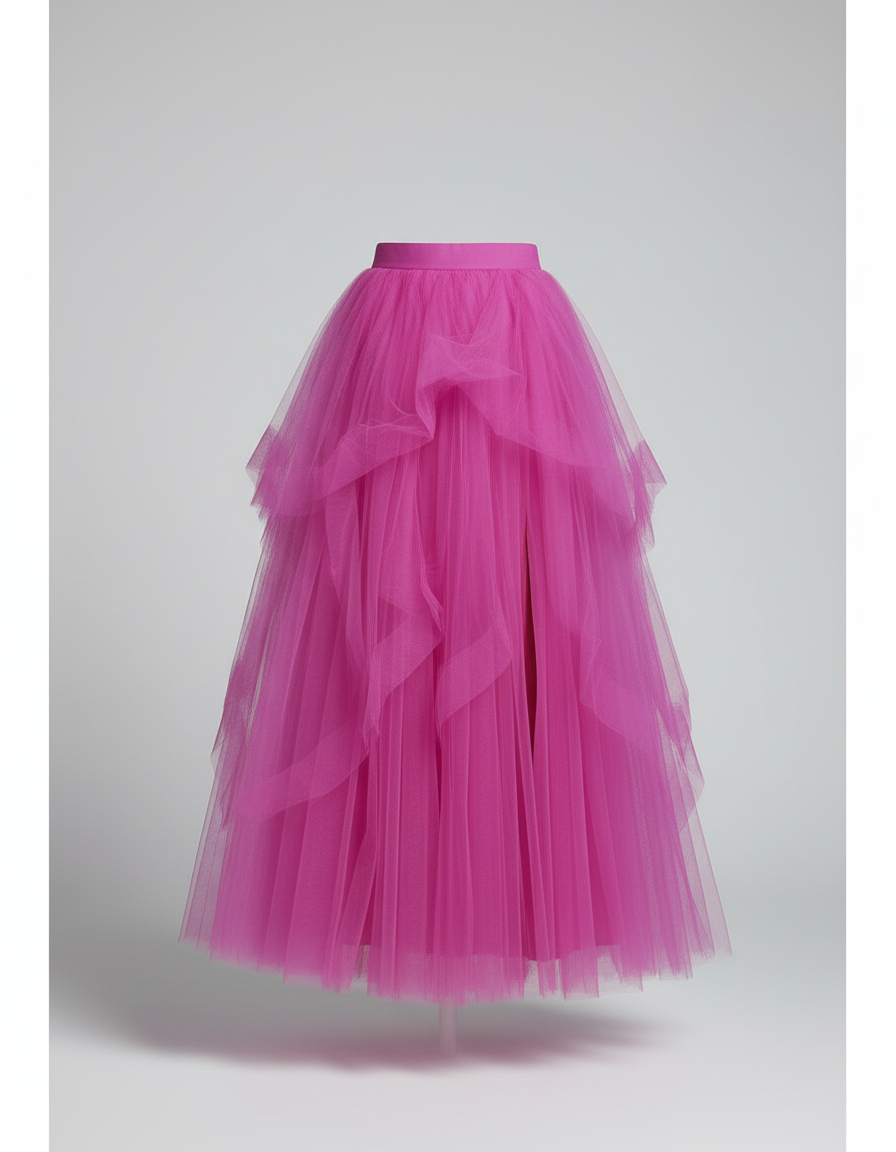Incarnez la grâce et l'audace avec notre Jupe Longue Voile Fendue. Confectionnée dans un tulle rose fuchsia aérien et luxueux, cette pièce maîtresse est conçue pour captiver. Sa silhouette bouffante, sublimée par une fente audacieuse, offre un mouvement spectaculaire à chaque pas. Nous avons méticuleusement travaillé le tombé pour qu'il épouse la silhouette sans jamais la contraindre, garantissant une liberté de mouvement absolue. Malgré son volume somptueux, la légèreté du voile assure un confort inégalé, vous permettant de danser et de vous déplacer avec aisance toute la soirée.