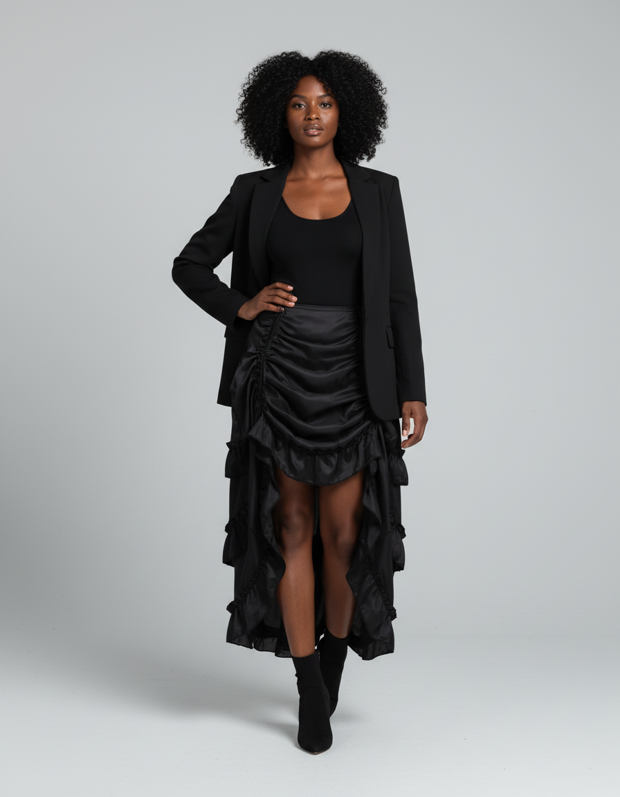 Sublimez votre silhouette avec notre Jupe Longue Volants Asymétrique en satin noir, une pièce maîtresse qui incarne l'audace et le raffinement. Conçue dans un satin fluide et lumineux, cette jupe unique se distingue par son jeu de volants délicats et sa coupe asymétrique audacieuse, offrant un mouvement captivant à chaque pas. Idéale pour les soirées où l'on souhaite marquer les esprits, elle transforme instantanément une tenue en une déclaration de style sophistiquée et moderne.