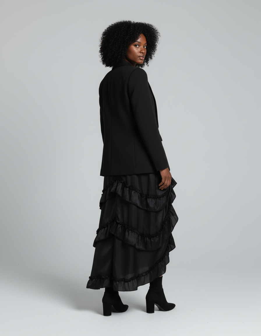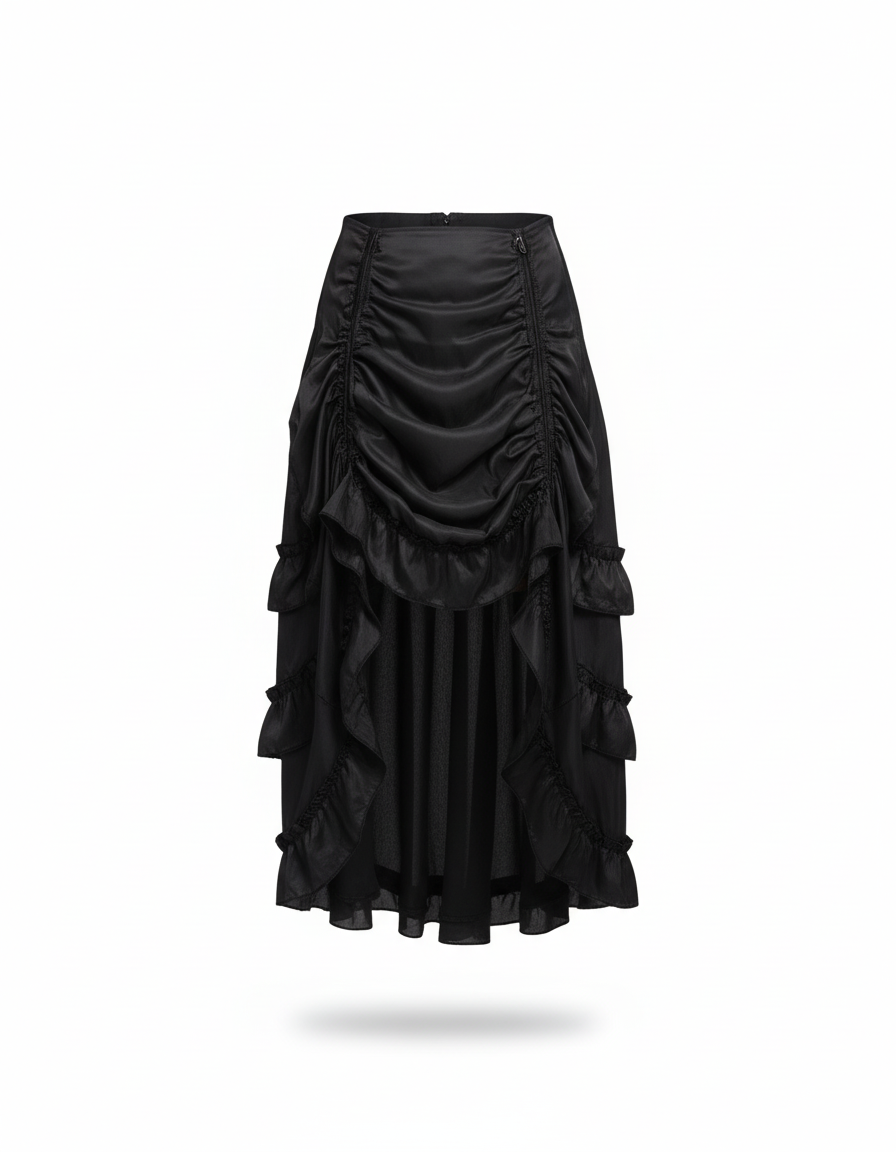 La jupe est de couleur noire et présente des volants sur plusieurs niveaux. Sa coupe est asymétrique avec une longueur plus courte à l'avant et des détails froncés plissés.