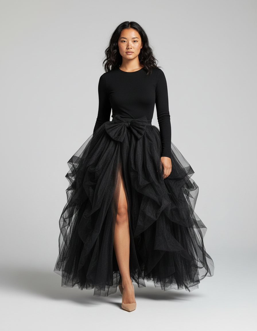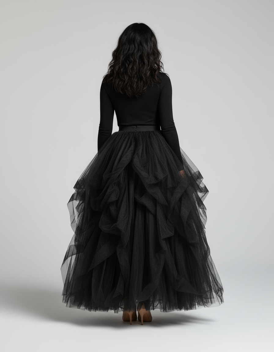 La Jupe Longue Volants Fendue Élégante est une ode à la sophistication moderne. Confectionnée dans un tulle noir d'une légèreté exquise, ses volants en cascade créent une silhouette volumineuse et aérienne, tandis que sa fente audacieuse révèle avec grâce la jambe, offrant une touche de sensualité maîtrisée. Pensée pour sublimer sans contraindre, cette pièce assure un confort inégalé : sa taille est conçue pour un maintien parfait, et la souplesse du tissu garantit une liberté de mouvement totale, vous permettant de virevolter avec aisance lors de chaque événement.
