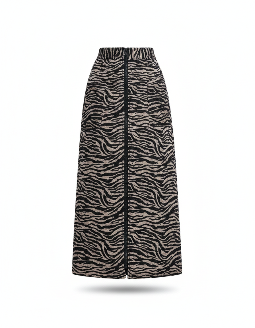 Cette jupe longue présente un motif zébré sur toute sa surface. Elle est dotée d'une fermeture éclair verticale située sur le devant.