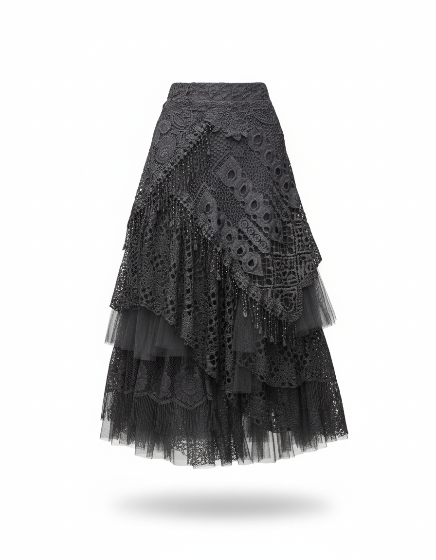 Cette jupe est une pièce longue de couleur gris foncé, présentant une superposition de motifs en dentelle ajourée et des couches de tulle.