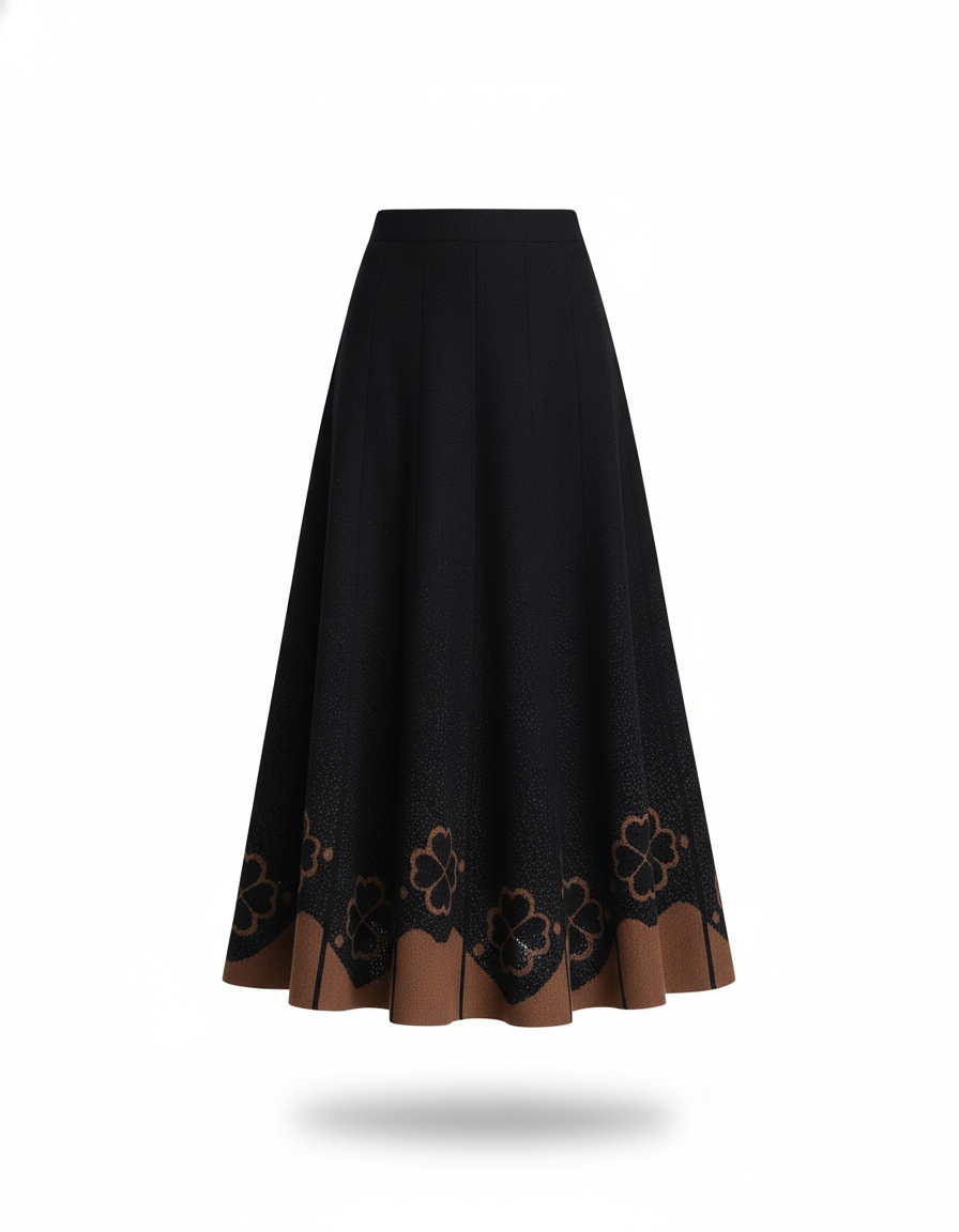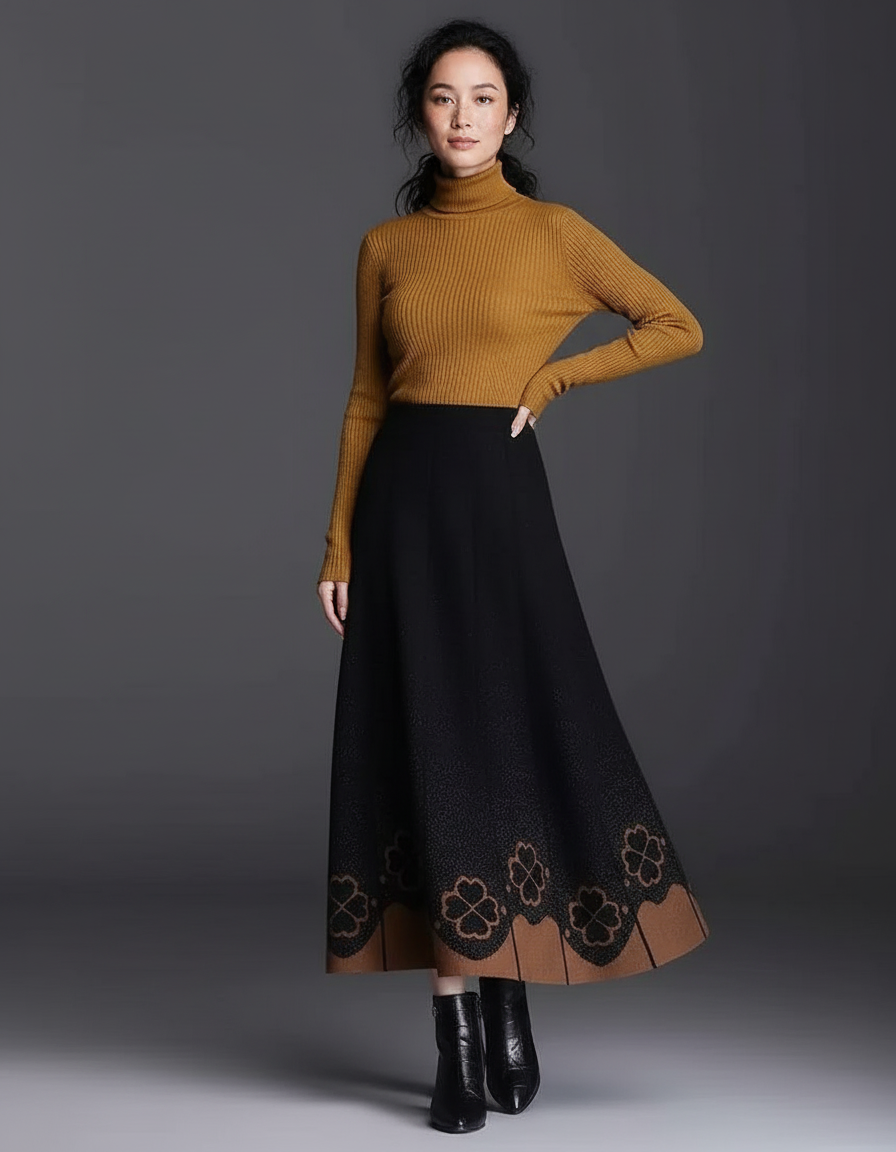Ce qui distingue notre Jupe Mi-Longue Hiver, c'est son design unique et sa qualité irréprochable. Loin des coupes rigides, sa maille fluide offre une silhouette aérienne et flatteuse pour toutes les morphologies. Le subtil motif jacquard au bas de la jupe, avec ses trèfles délicats et sa bordure contrastante, ajoute une touche d'originalité discrète et luxueuse, affirmant votre sens du détail. Une pièce versatile qui élève instantanément n'importe quel ensemble, vous garantissant de rester élégante et à l'aise tout au long de l'hiver.