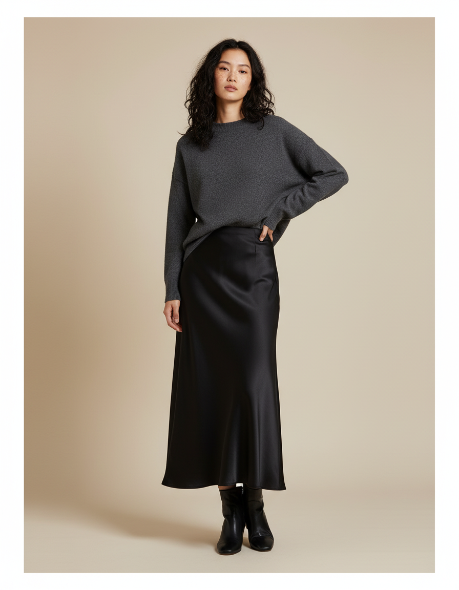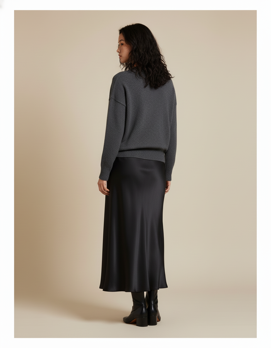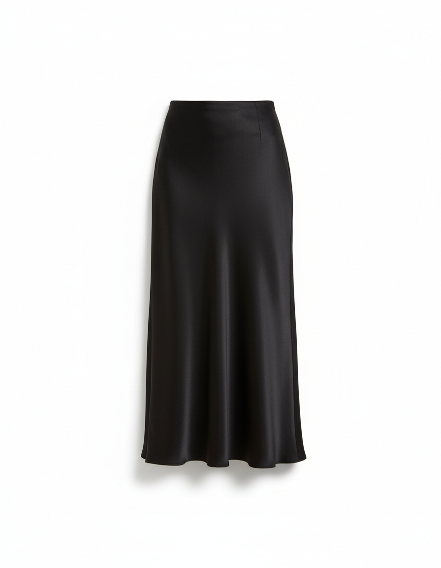 Notre Jupe Mi-Longue Fluide Noire est l'incarnation même du chic intemporel. Confectionnée dans un satin luxueux, sa coupe évasée assure un tombé parfait qui sublime chaque silhouette, offrant une liberté de mouvement inégalée. Que vous traversiez une salle de bal ou une galerie d'art, sa matière douce et légère vous enveloppe avec une discrétion raffinée. Le satin de haute qualité glisse sur la peau, garantissant un confort absolu du matin au soir, sans jamais entraver votre pas.