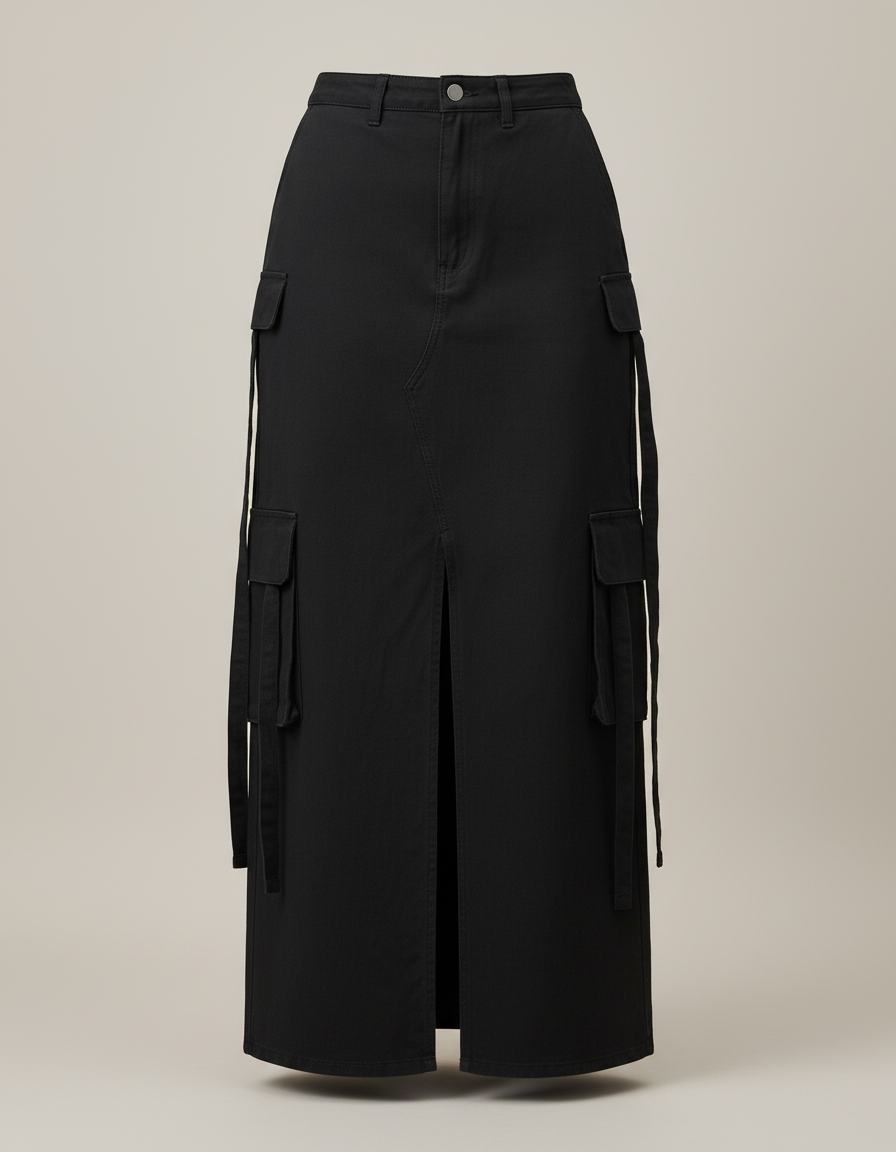 Découvrez la Jupe Militaire Longue, une pièce maîtresse conçue pour la femme moderne qui ne transige ni sur le style, ni sur le confort. Confectionnée dans un coton noir dense et fluide, cette jupe droite offre une allure structurée mais aérienne. Sa fente avant subtilement audacieuse assure une liberté de mouvement et une touche de sensualité discrète, la rendant idéale pour celles qui recherchent une silhouette distinctive et polyvalente. Ce qui la différencie ? L'intégration magistrale de détails inspirés du vestiaire militaire – ses poches cargo fonctionnelles et ses liens ajustables – transformant une simple jupe en une déclaration de mode audacieuse et raffinée.