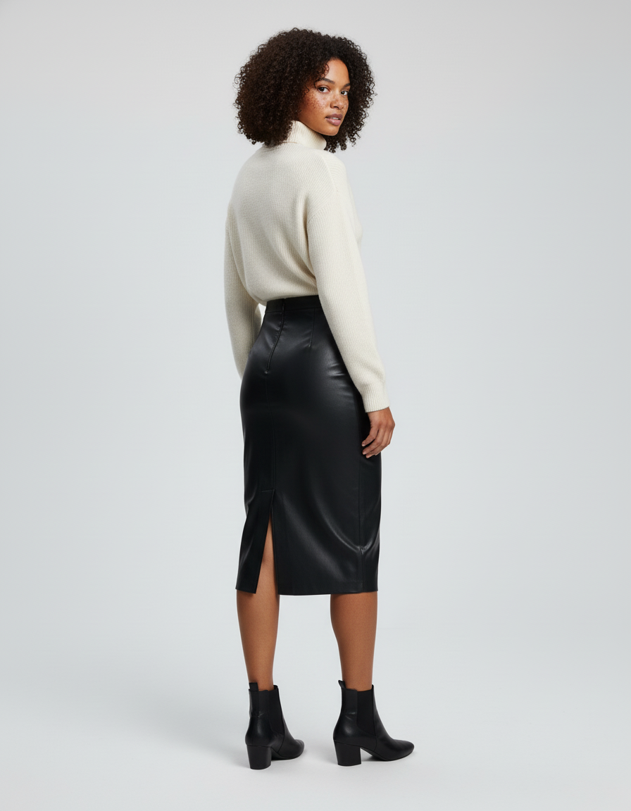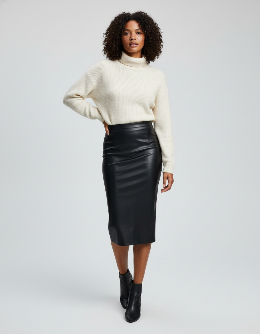 Véritable caméléon de votre dressing, cette jupe tube en cuir noir se métamorphose au gré de vos envies. Pour une allure sophistiquée au bureau, associez-la à une chemise en soie et des escarpins classiques. En soirée, osez un top plus audacieux et des bottines à talon pour un style affirmé. Pour une touche décontractée chic, comme sur notre image, mariez-la à un pull en maille douce (tel un col roulé crème) et des bottes élégantes. Une pièce maîtresse qui sublime votre style en toute occasion.
