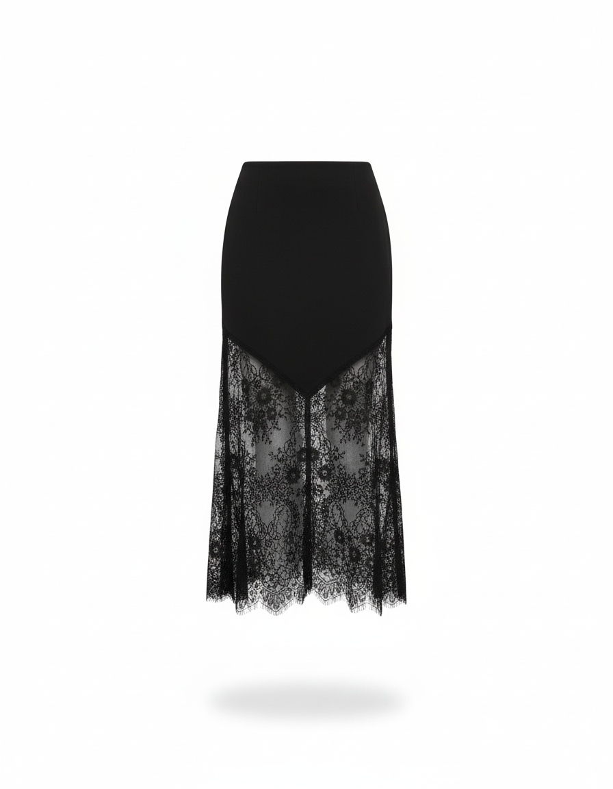 Ce qui rend cette jupe véritablement unique, c'est son mariage audacieux entre une coupe asymétrique structurée et la délicatesse d'une dentelle florale noire transparente. La fente subtile, révélant avec art la jambe à travers la dentelle, ajoute une touche de mystère et de sensualité sans jamais compromettre l'élégance. Confectionnée dans des matériaux haut de gamme, elle promet un confort exceptionnel et une tenue impeccable, s'adaptant parfaitement à vos soirées les plus raffinées comme à vos événements de journée où l'on attend une touche de chic discret.