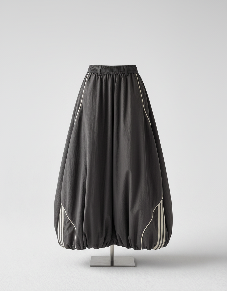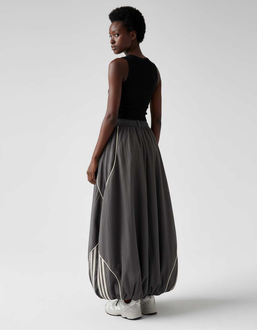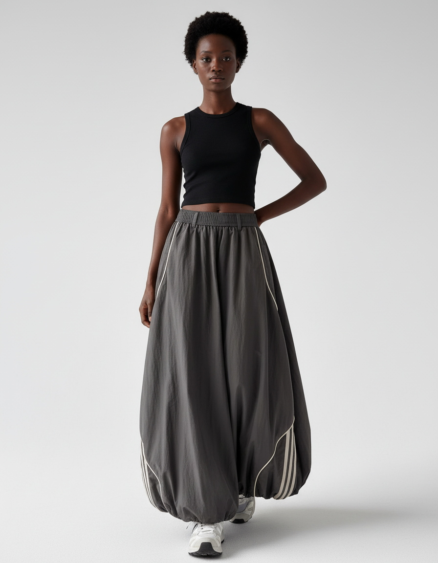 The person in the image is wearing a fashionable and athletic-inspired outfit. Here's a breakdown of the attire: * **Top:** A black, ribbed, sleeveless crop top. * **Bottom:** A voluminous, dark grey (charcoal) long skirt or wide-leg pant. It features a visible elasticated waistband, white piping details that trace curves on the fabric, and a prominent set of three off-white stripes on the side, reminiscent of Adidas branding. The hem is gathered, creating a "bubble" or balloon effect. * **Footwear:** A pair of white and grey athletic sneakers with dark soles.
