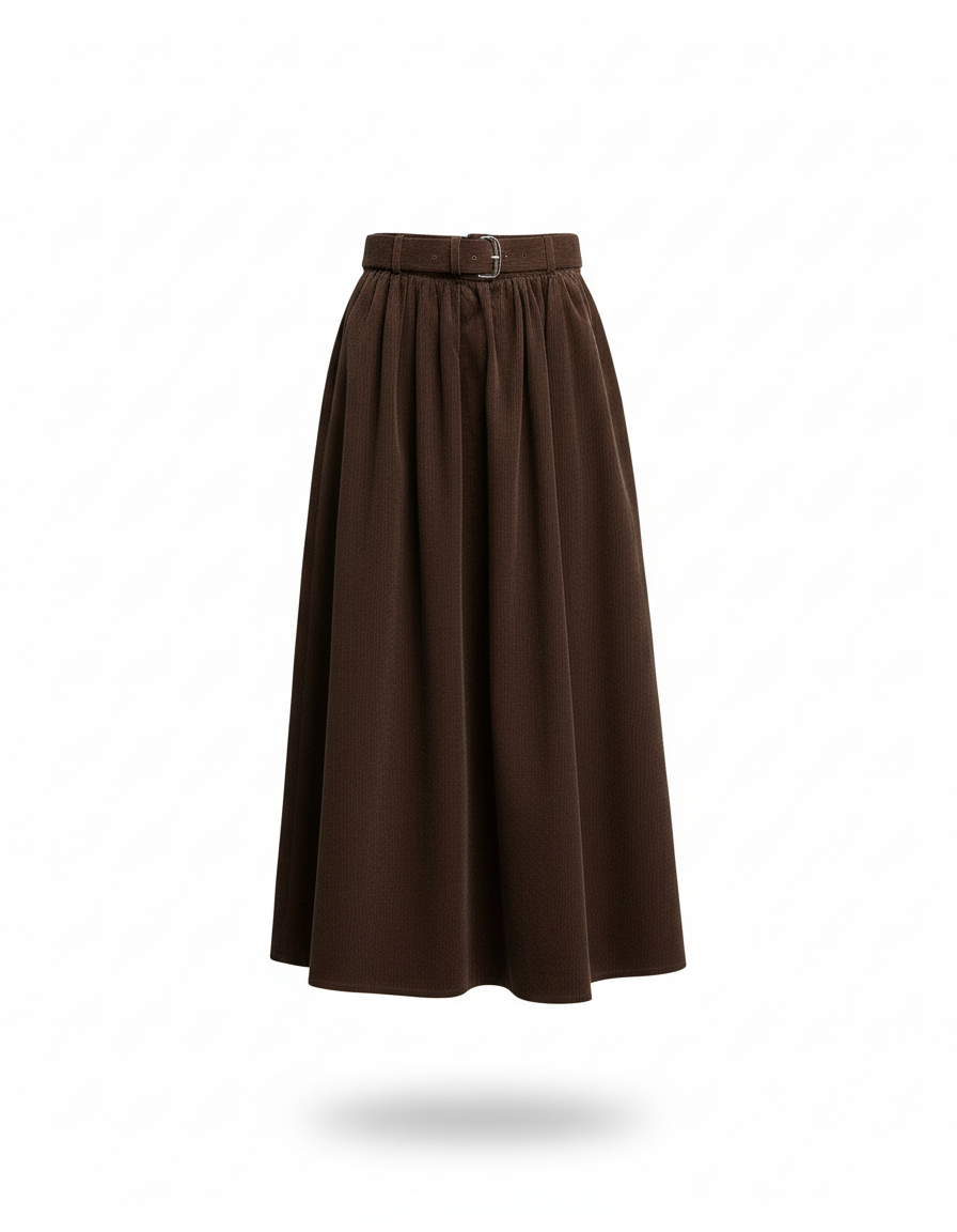 Cette jupe longue présente une coupe évasée, confectionnée dans un tissu marron. Elle est dotée d'une ceinture à la taille.