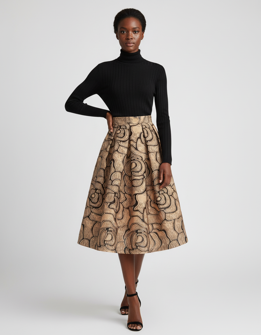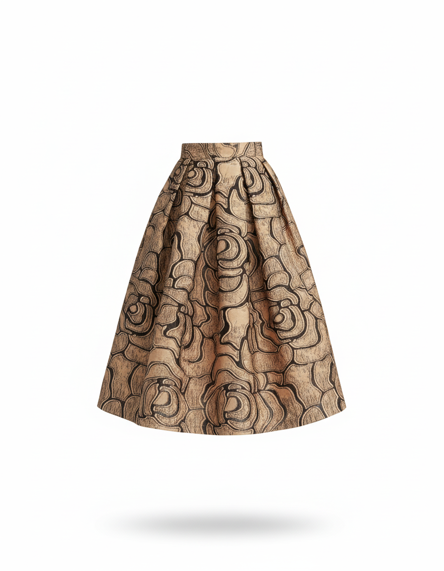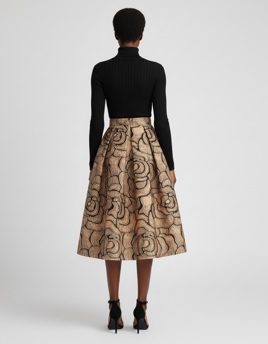 Ce qui distingue véritablement notre Jupe Patineuse, c'est son tissu d'exception. Un jacquard luxueux aux motifs floraux stylisés en noir sur un fond doré sable, apportant une texture riche et un jeu de lumière subtil qui captivera le regard. Chaque pli est pensé pour accentuer le volume élégant sans alourdir, conférant à la jupe une tenue parfaite et un mouvement aérien. Bien plus qu'un simple vêtement, c'est une œuvre d'art portable, un investissement dans un style intemporel qui élèvera instantanément votre garde-robe avec une touche de luxe discret et une originalité affirmée.
