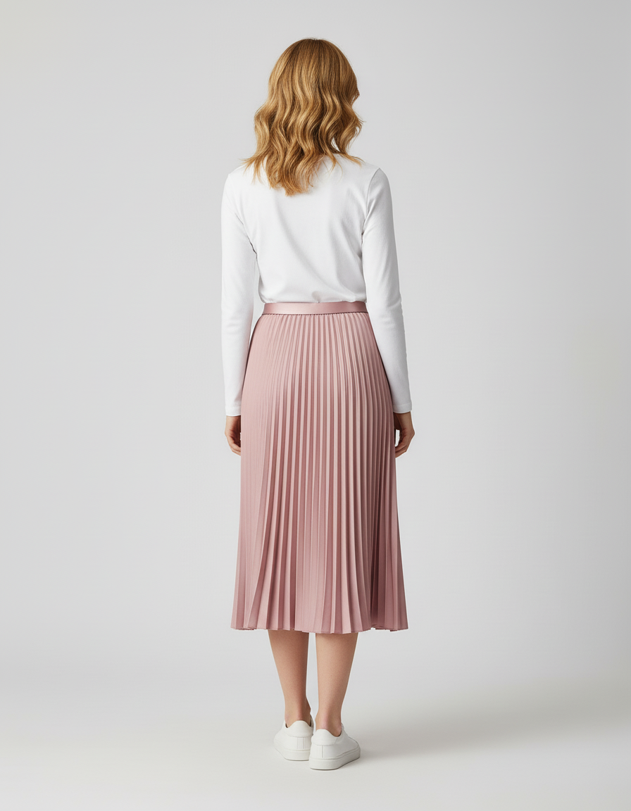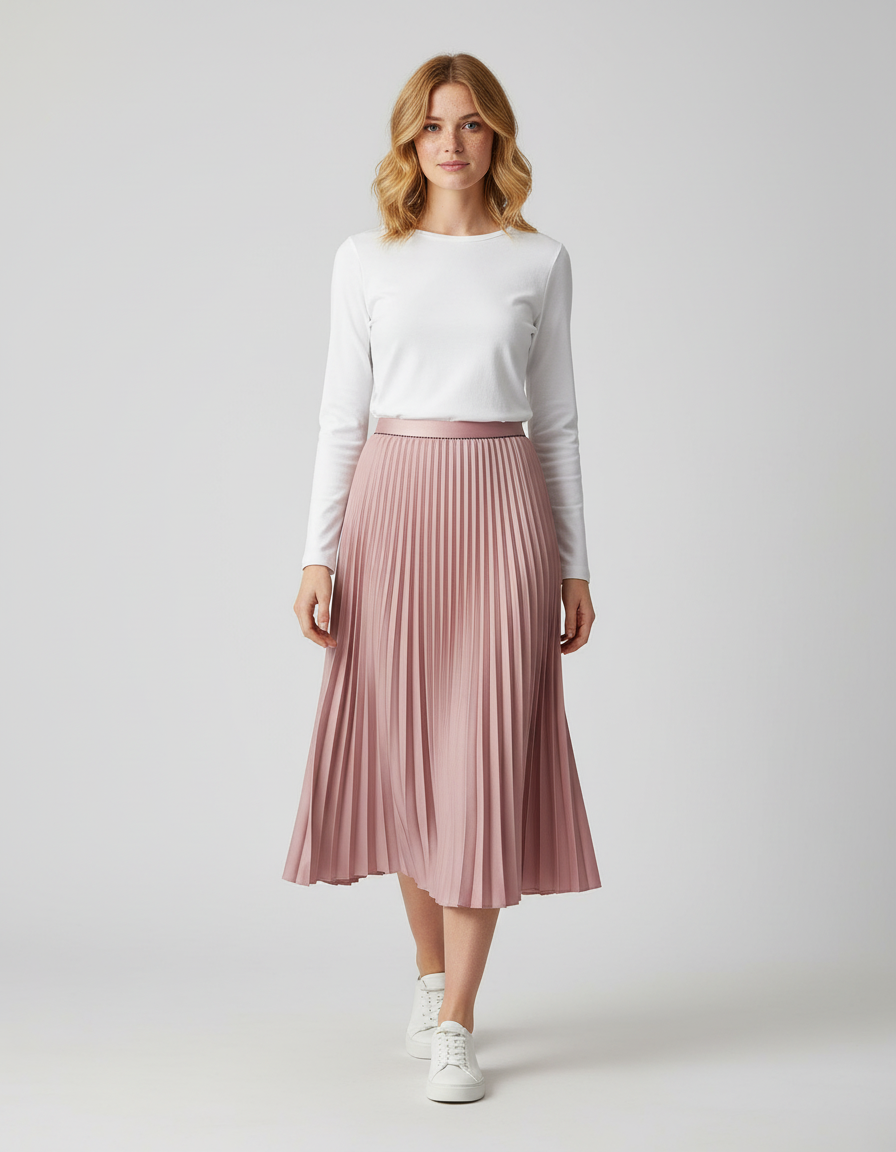 Découvrez la Jupe Plissée Longue, une pièce maîtresse conçue pour sublimer votre allure avec une grâce naturelle. Son satin fluide rose caresse la silhouette, offrant une liberté de mouvement absolue. Que ce soit pour une journée décontractée, associée à un t-shirt blanc impeccable et des sneakers comme sur l'image, ou pour un événement plus sophistiqué, rehaussée d'une blouse en soie et de talons, cette jupe s'adapte à toutes vos envies. Le confort est au rendez-vous, vous permettant de vous déplacer avec aisance et élégance, du matin jusqu'au soir, sans jamais compromettre votre style.