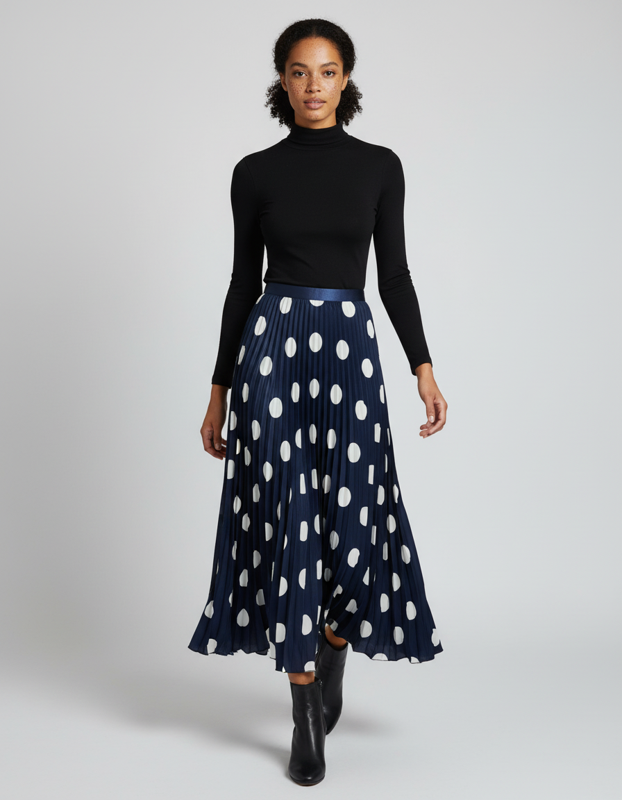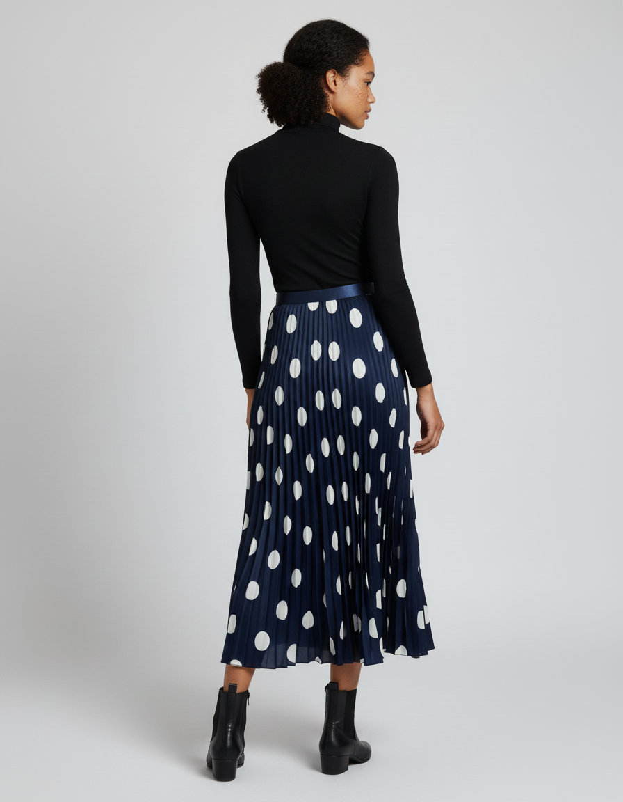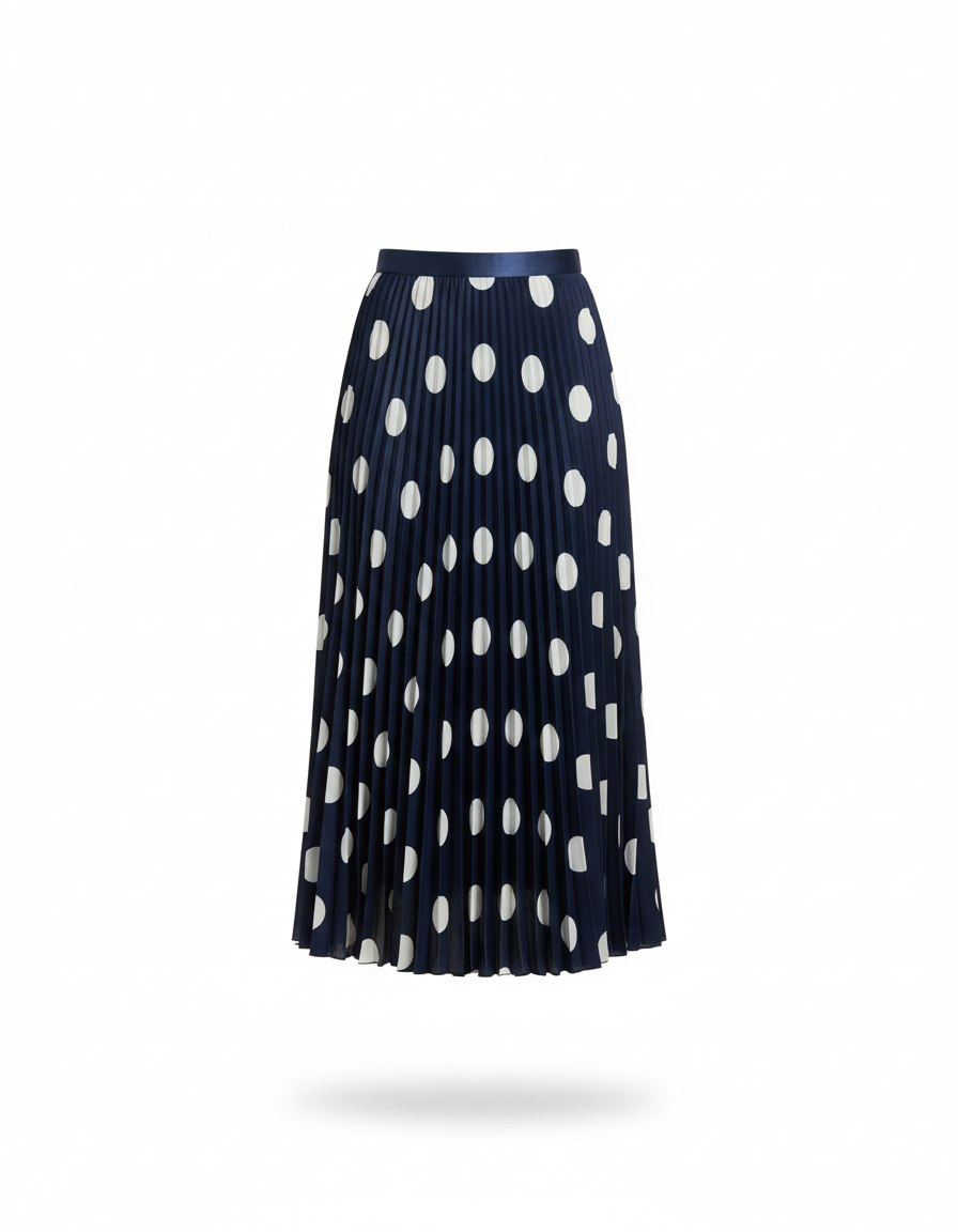 Jupe Plissée Longue Bleu Marine à Pois Blancs