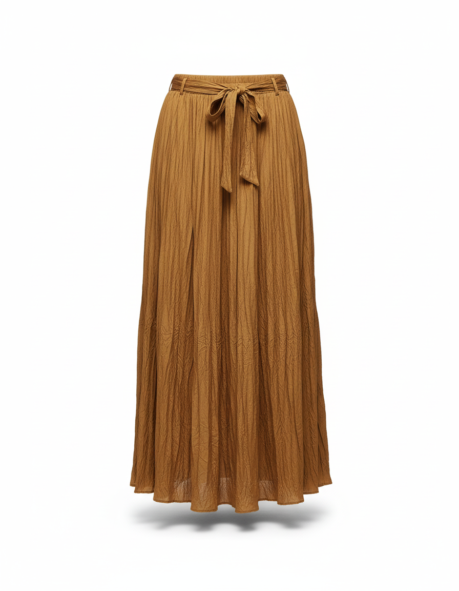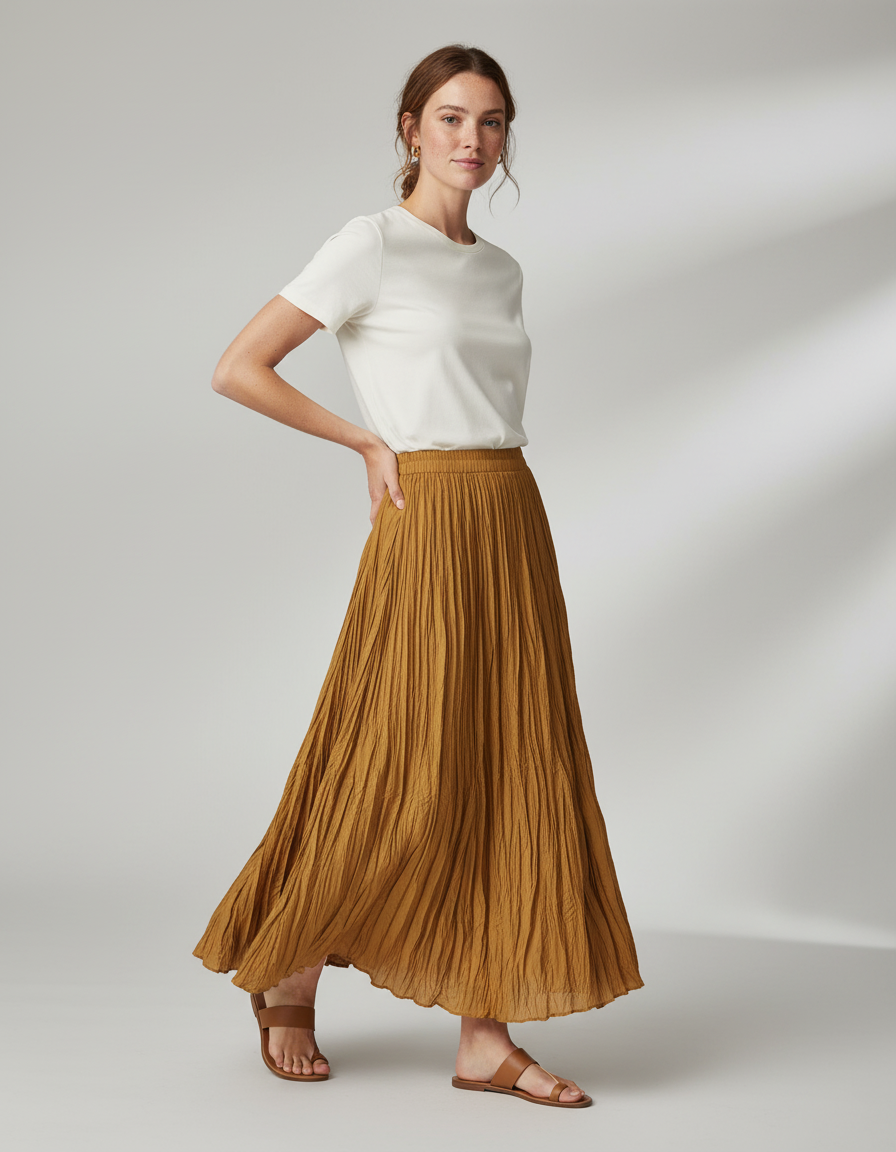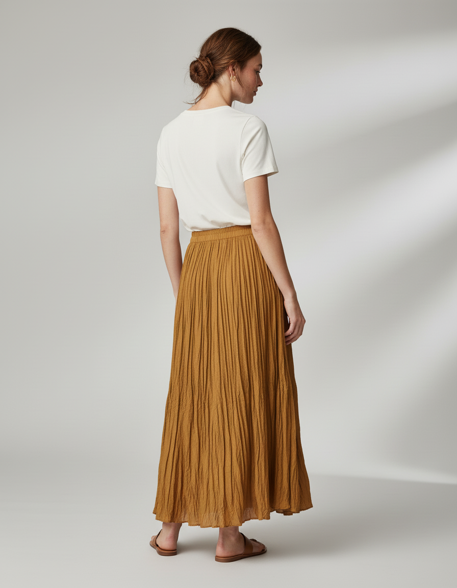 Craquez pour notre jupe longue plissée jaune moutarde, alliant style et confort pour une silhouette aérienne.