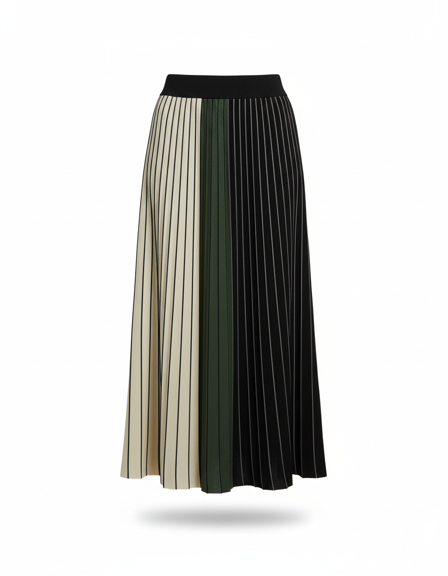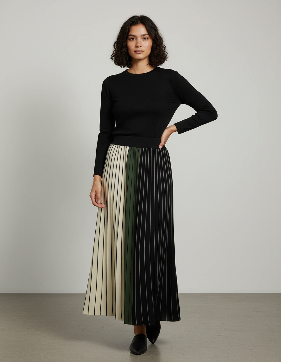 Ce qui la distingue ? Son design audacieux et contemporain. Les plissés verticaux, rythmés par un jeu de couleurs et de fines rayures harmonieux – mêlant des tons crème lumineux, un vert olive profond et un noir intense – créent une dynamique visuelle captivante. Chaque mouvement est une danse de textures et de motifs, conférant à votre allure une sophistication unique. Plus qu'une simple jupe, c'est une déclaration de style, un investissement dans une pièce intemporelle qui promet de faire sensation et de sublimer votre garde-robe avec une touche de modernité inégalée.