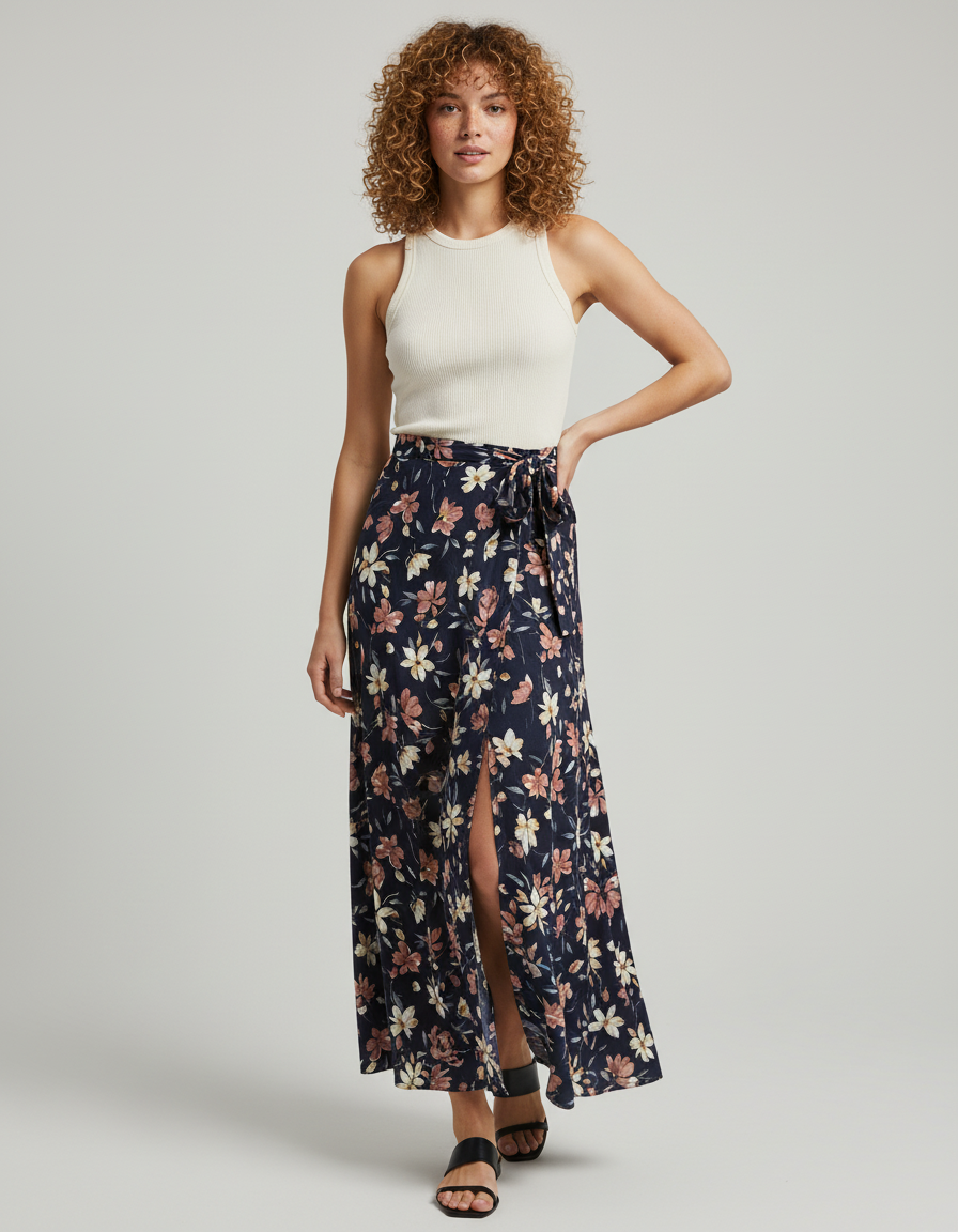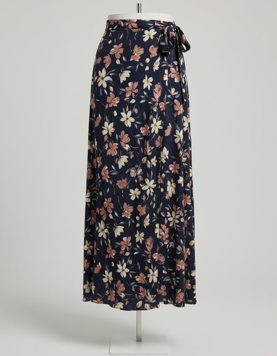 Cette jupe longue est de type portefeuille et présente un motif floral. Elle dispose d'un lien à la taille pour l'ajuster.