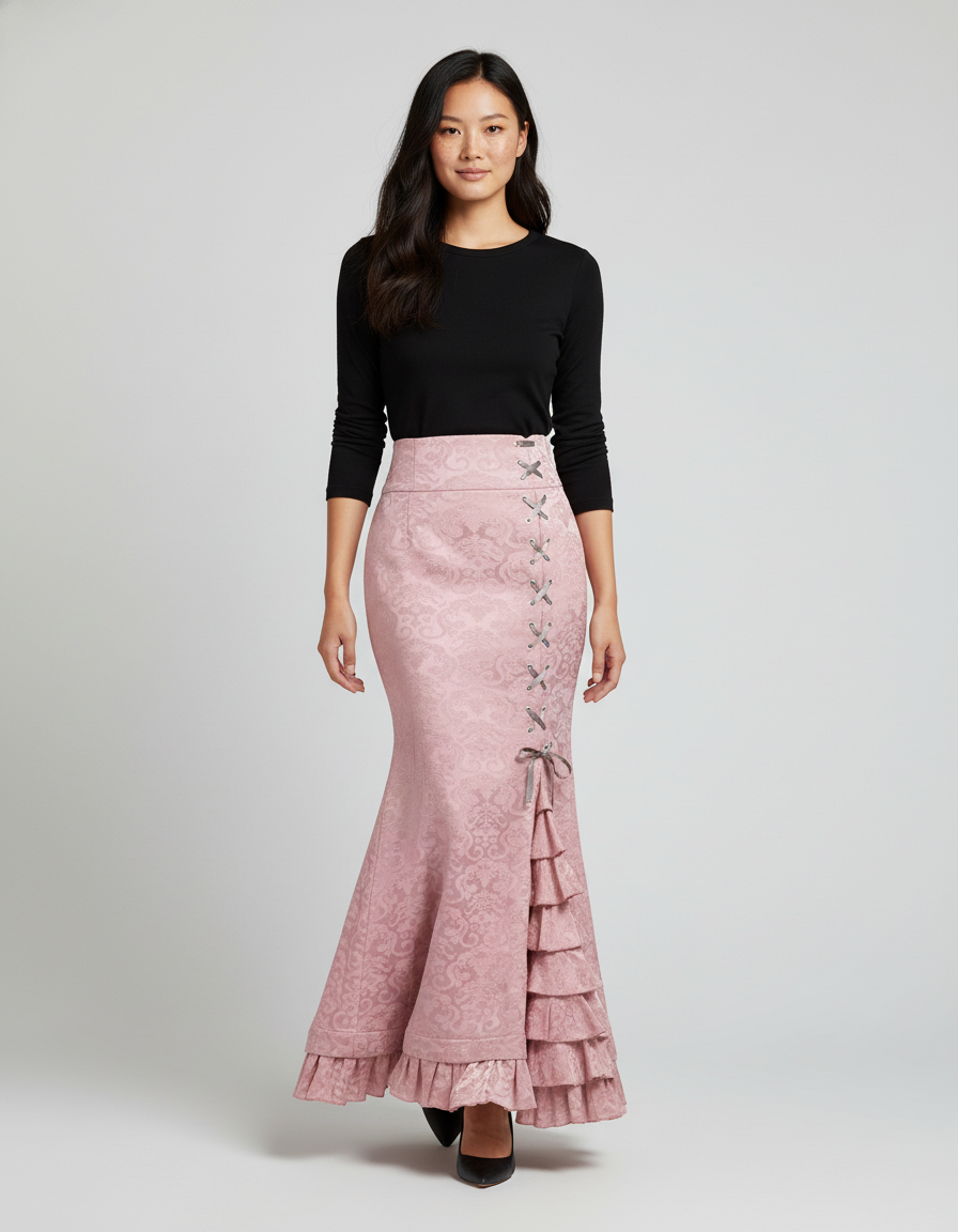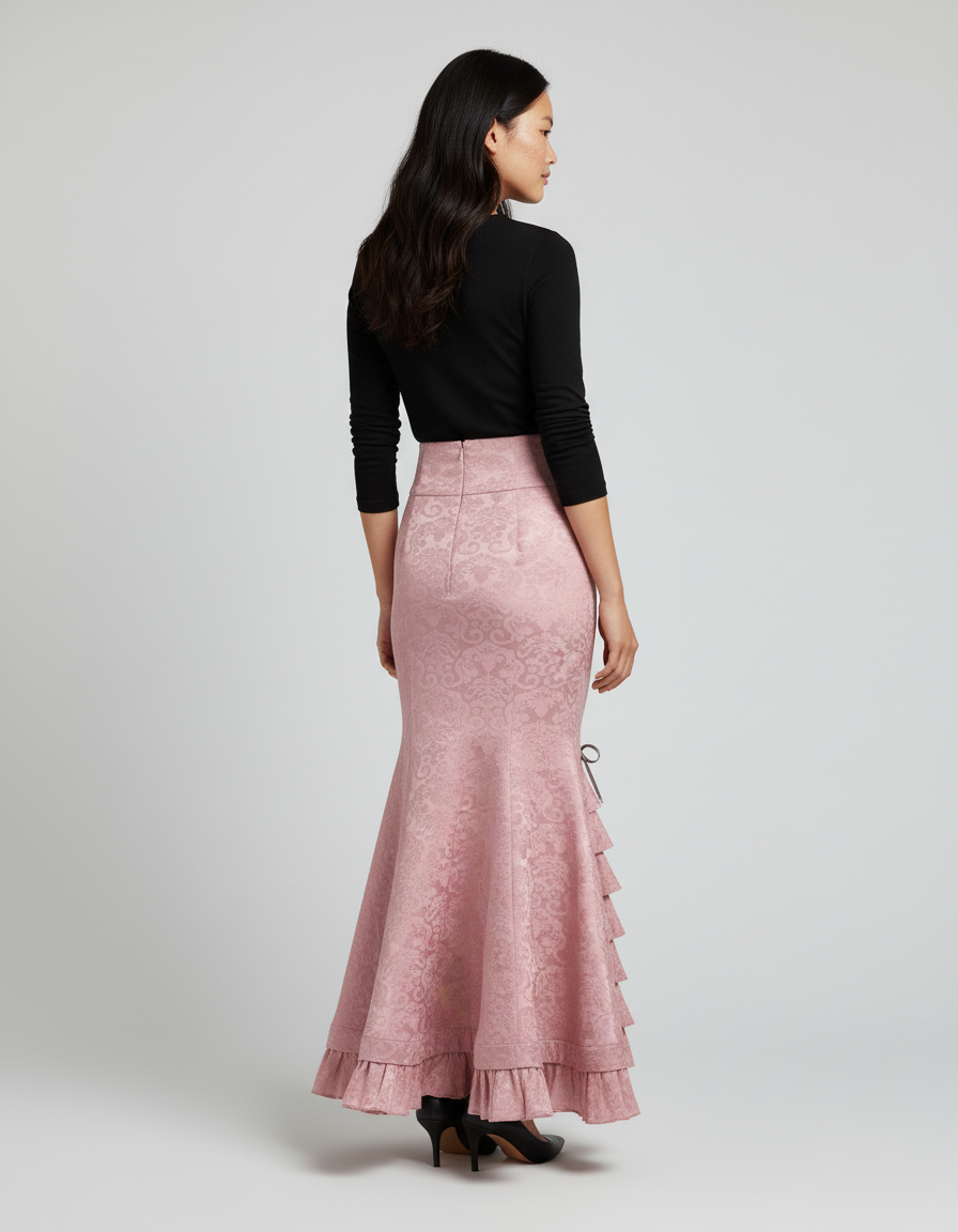 Conçue pour exalter la silhouette, notre Jupe Sirène Longue rose poudré est une pièce maîtresse de raffinement. Son tissu délicat, orné d'un motif sophistiqué, épouse gracieusement vos courbes sans jamais entraver vos mouvements. L'ingénieux laçage latéral et les volants étagés, qui s'animent à chaque pas, confèrent à cette jupe une allure unique et audacieuse. Nous avons pensé chaque détail pour vous assurer un confort absolu et une liberté de mouvement surprenante, vous permettant de briller en toute confiance.