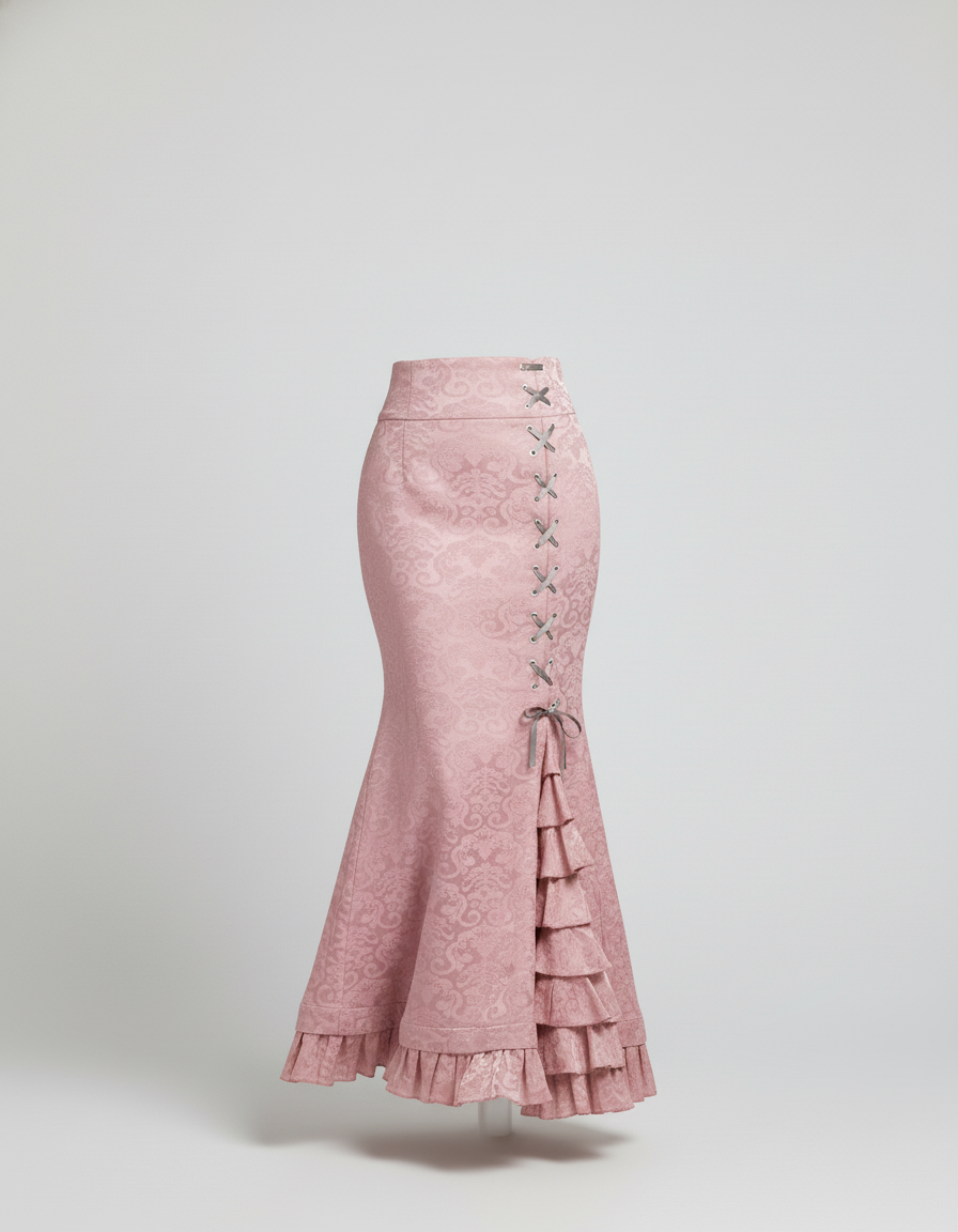 Ce modèle unique se distingue par son tissu brocart rose délicatement texturé, orné de motifs damassés qui chuchotent le luxe. Le détail du laçage façon corset sur le côté ajoute une touche d'audace contemporaine, tandis que les volants étagés, disposés avec art, confèrent à la jupe un mouvement spectaculaire et une finition opulente. Chaque élément est pensé pour une allure inoubliable, faisant de cette jupe une œuvre d'art portable qui ne manquera pas de faire tourner les têtes.