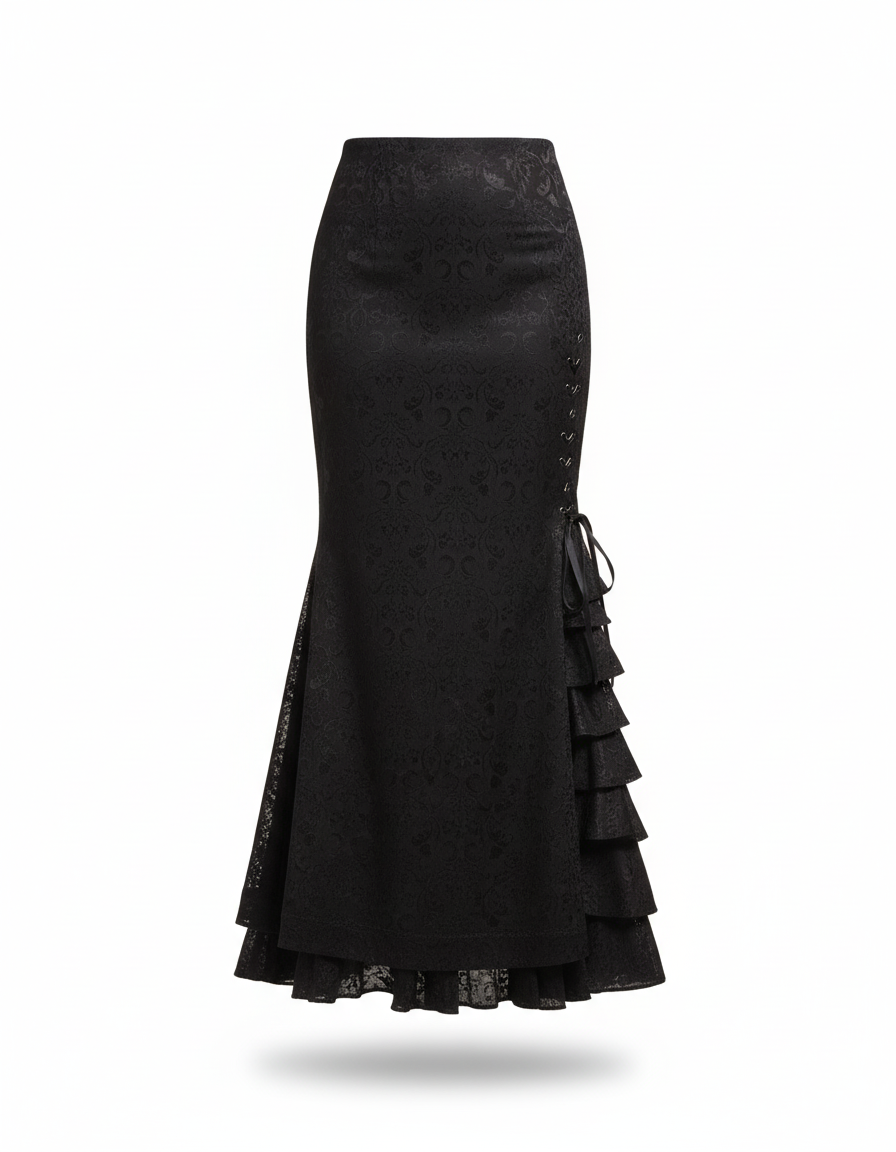 Jupe Sirene Longue Noire avec Volants Latéraux