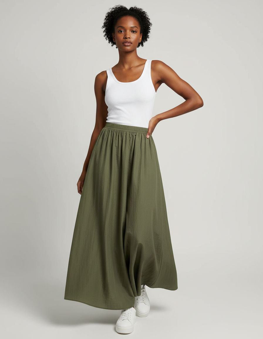 Here's a detailed description of the person, clothing, and accessories in the image: **Person:** The image features a young woman with dark, curly hair styled short. She has a serious yet poised expression, looking directly at the camera. Her skin tone is dark. She is posing with one hand on her hip. **Clothing:** 1. **Top:** She is wearing a white, ribbed tank top with a scoop neckline. The top appears to be fitted. 2. **Bottom:** She is wearing olive green, wide-leg, maxi-length pants. The pants have an elasticated waistband and a very relaxed, flowy fit, with a slightly textured or crinkled fabric. The voluminous cut gives them a skirt-like appearance, but the way the fabric gathers around her ankles strongly suggests they are pants (possibly a very wide-leg culotte or harem style). **Footwear:** 1. **Shoes:** She is wearing white lace-up sneakers with a visible, slightly elevated platform sole. **Accessories:** 1. **Earrings:** She appears to be wearing small, dark earrings, possibly studs or small hoops. 2. **Ring:** A ring is visible on the fourth finger of her left hand (the hand on her hip).