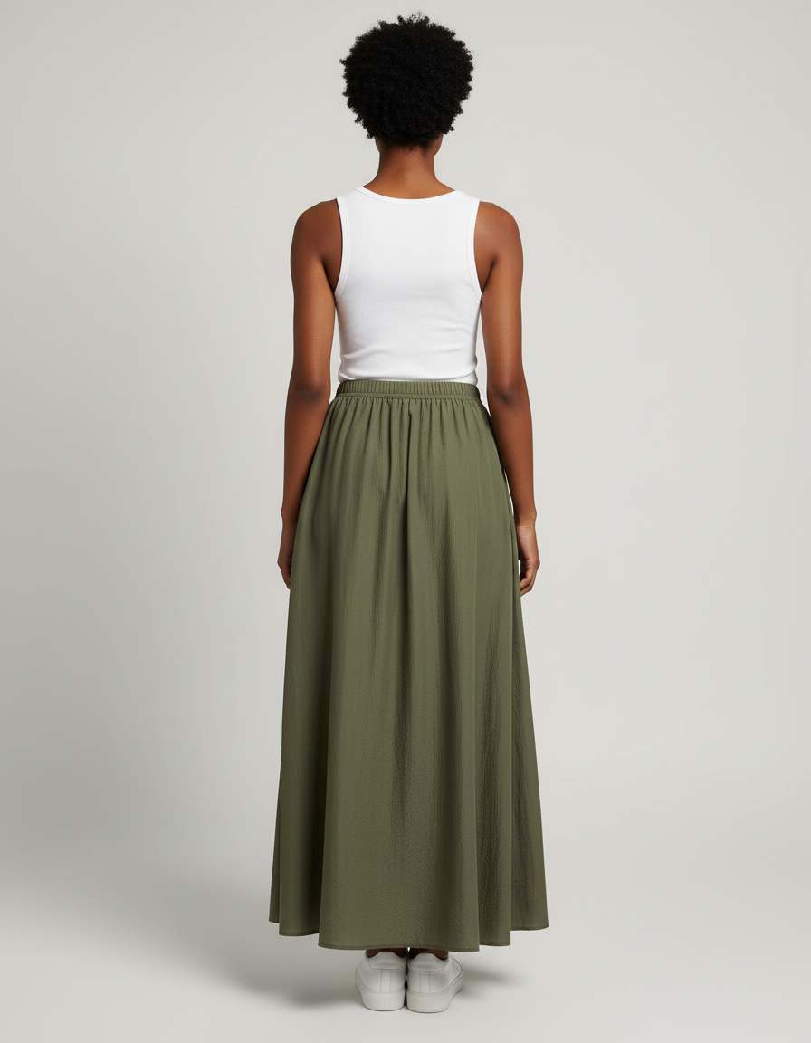 Cette jupe longue smockée allie confort et style pour toutes vos occasions décontractées.