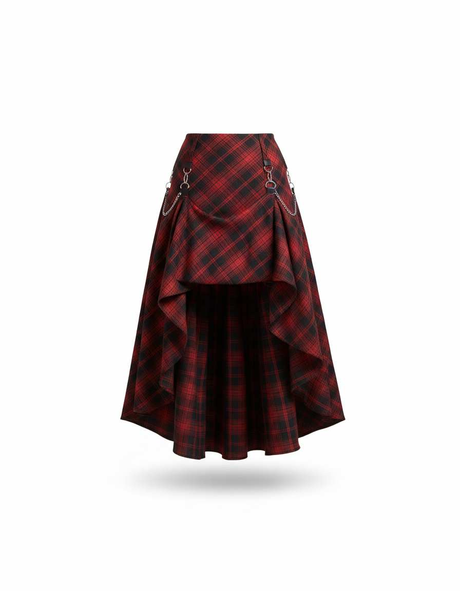 Cette jupe présente un motif à carreaux tartan rouge et noir. Sa coupe est caractérisée par un ourlet asymétrique, plus court à l'avant et plus long à l'arrière.