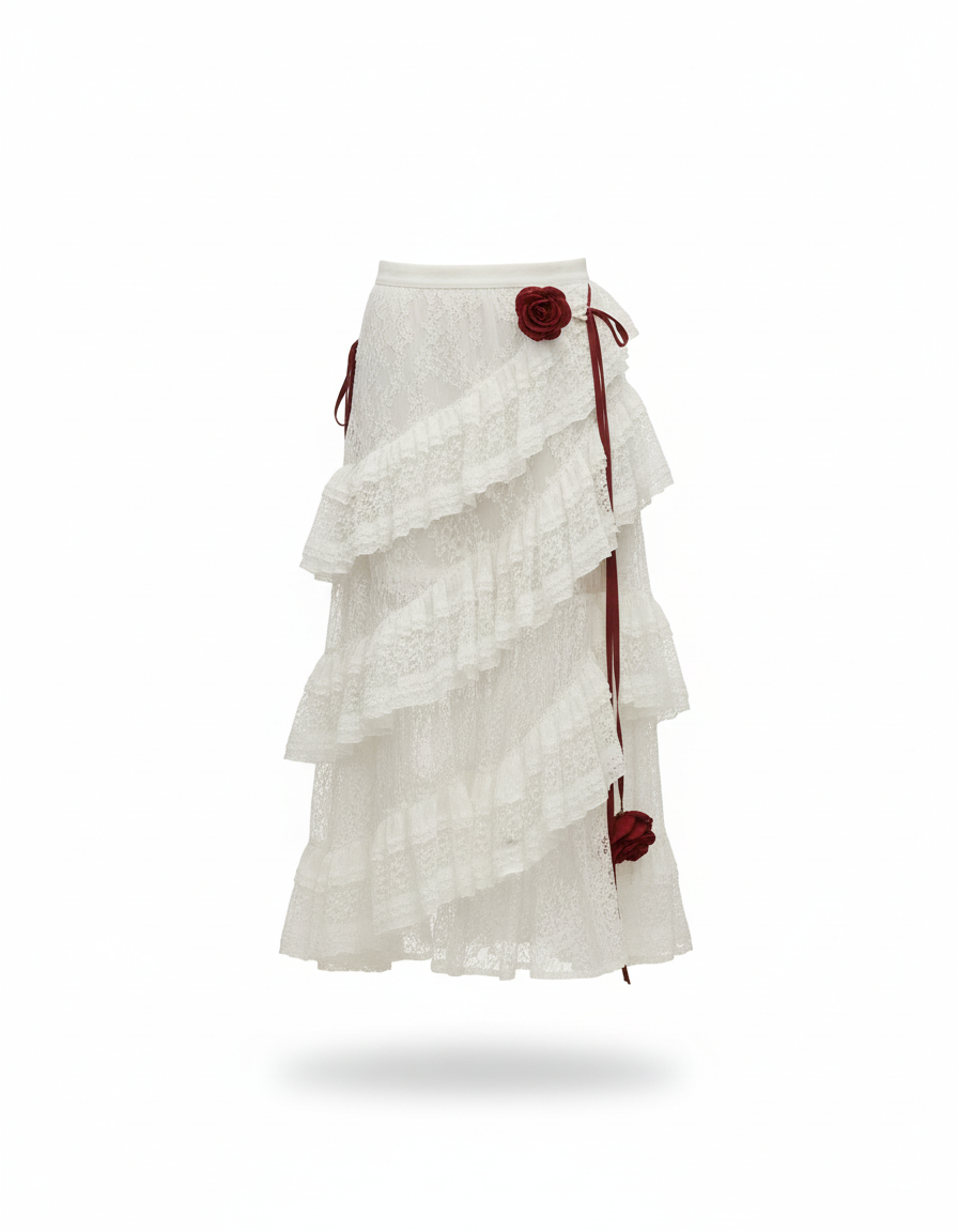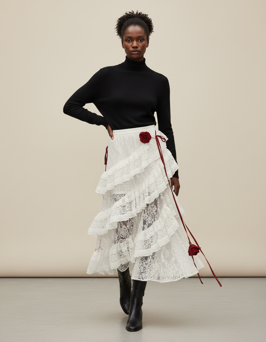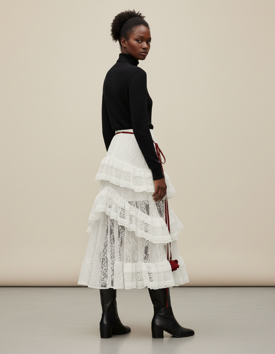 Cette jupe longue en dentelle à volants superposés offre une silhouette élégante et romantique avec une touche de modernité.