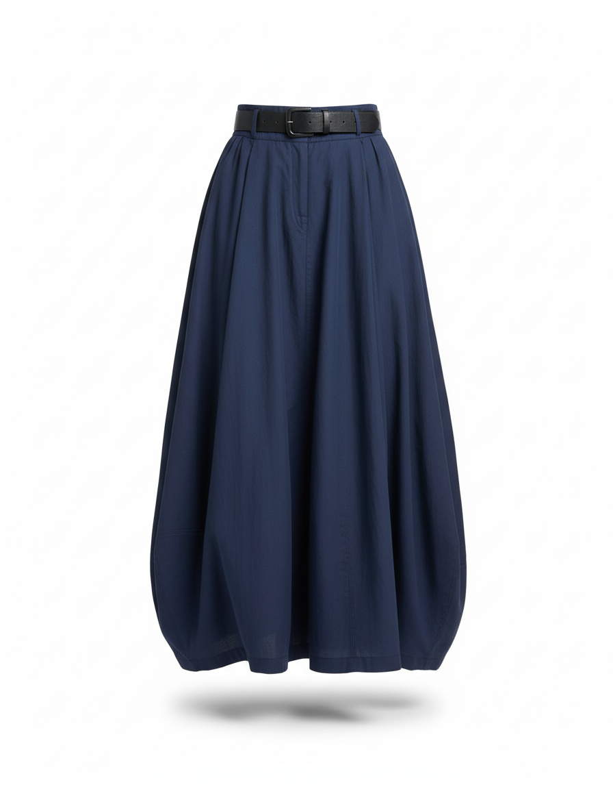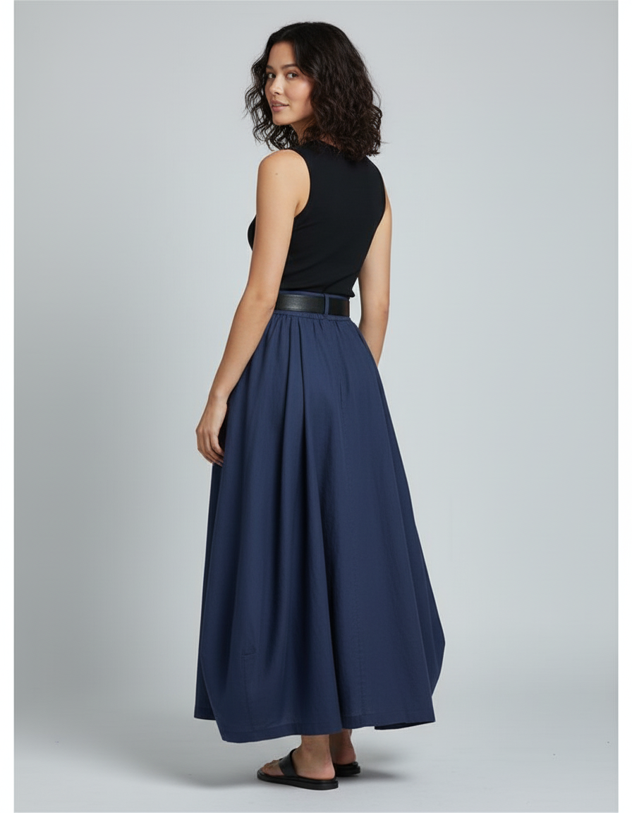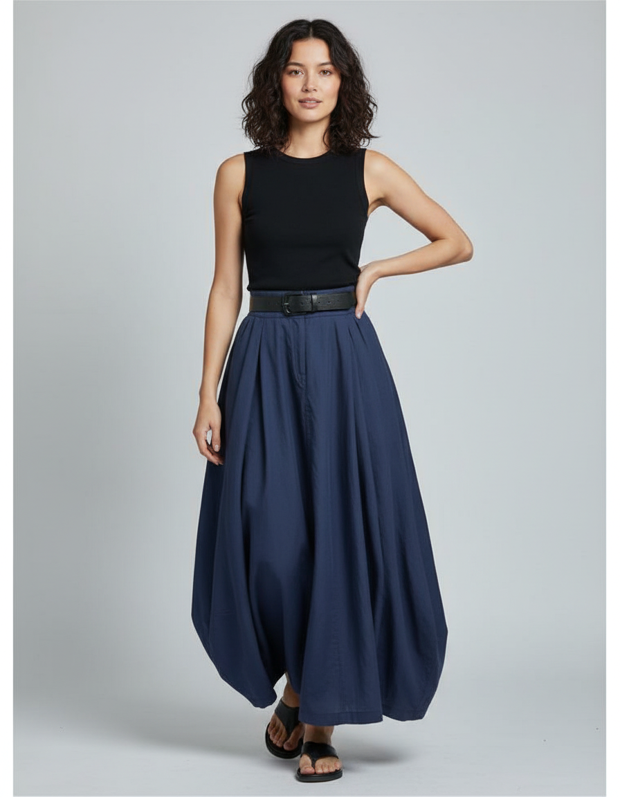 Découvrez notre Jupe Tulipe Longue, une pièce maîtresse conçue en coton premium bleu marine, alliant volume généreux et légèreté. Sa coupe ample et son tombé impeccable épousent naturellement vos mouvements, offrant une liberté inégalée du matin au soir. Le coton respirant garantit un confort optimal même par les journées les plus chaudes, tandis que sa silhouette bouffante unique apporte une touche d'originalité sophistiquée. Chaque détail a été pensé pour une allure à la fois décontractée et résolument chic, faisant de cette jupe un incontournable de votre garde-robe estivale.